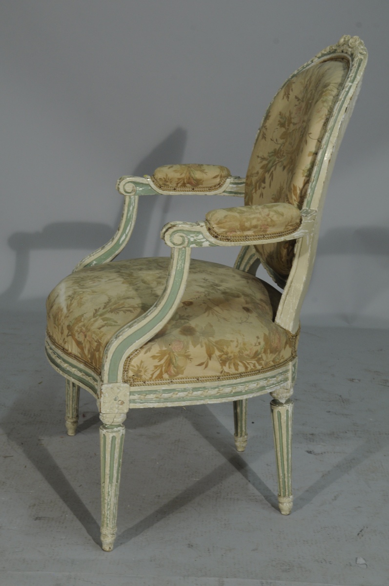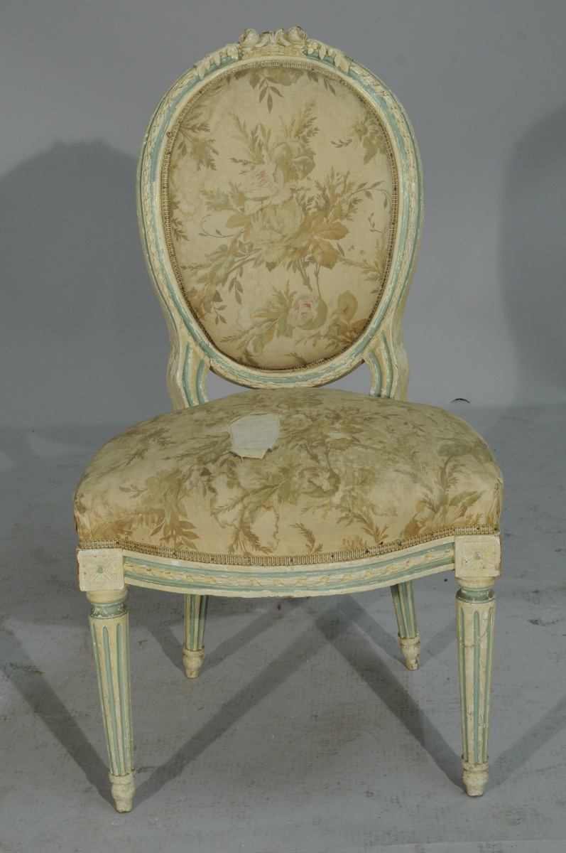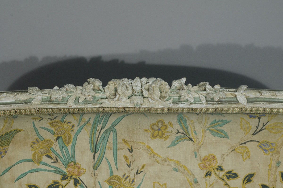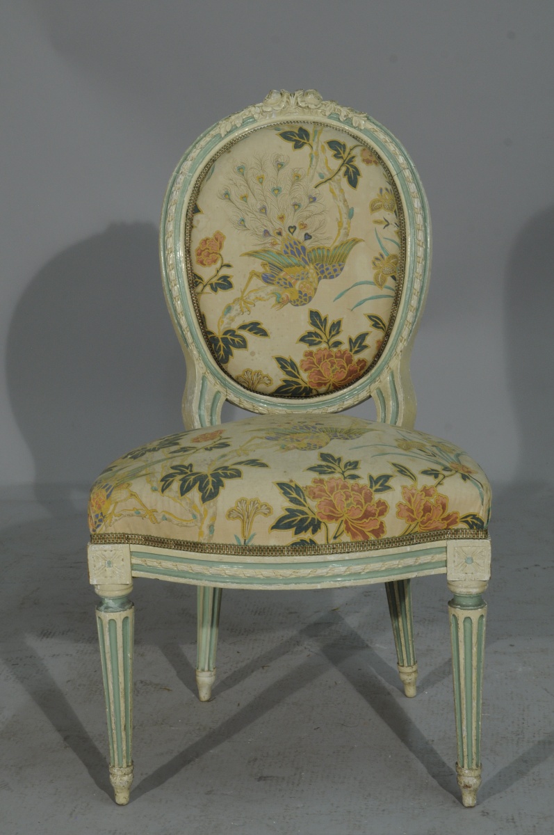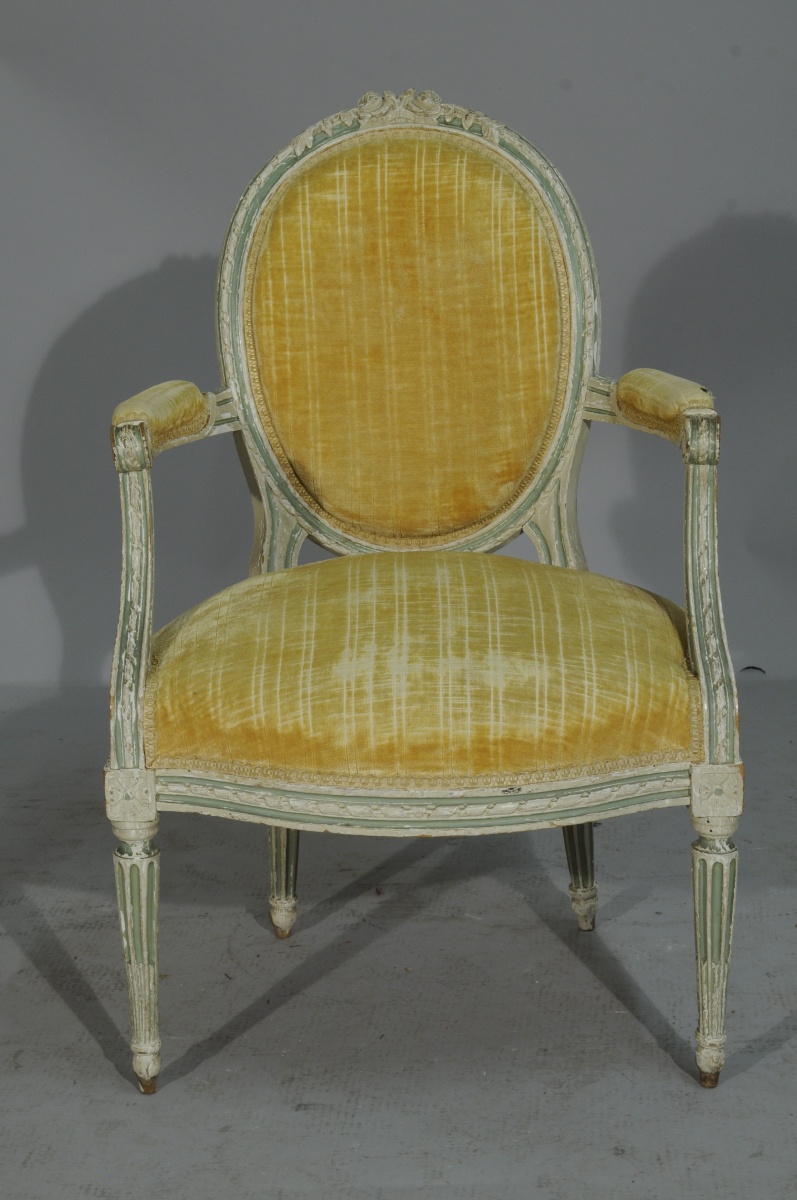 IMPORTANT SALON à dossier médaillon de 17 pièces comprenant : deux canapés, deux bergères, huit fauteuils cabriolets et cinq chaises en hêtre mouluré, sculpté et rechampi vert et crème. Accotoirs se terminant en volutes, et reposant sur des consoles galbées. Dés de raccordement sculptés de fleurons. Pieds fuselés et cannelés. Montants et traverses sculptés de rubans. Dossier sculpté d'une gerbe de roses et de feuillages noués.