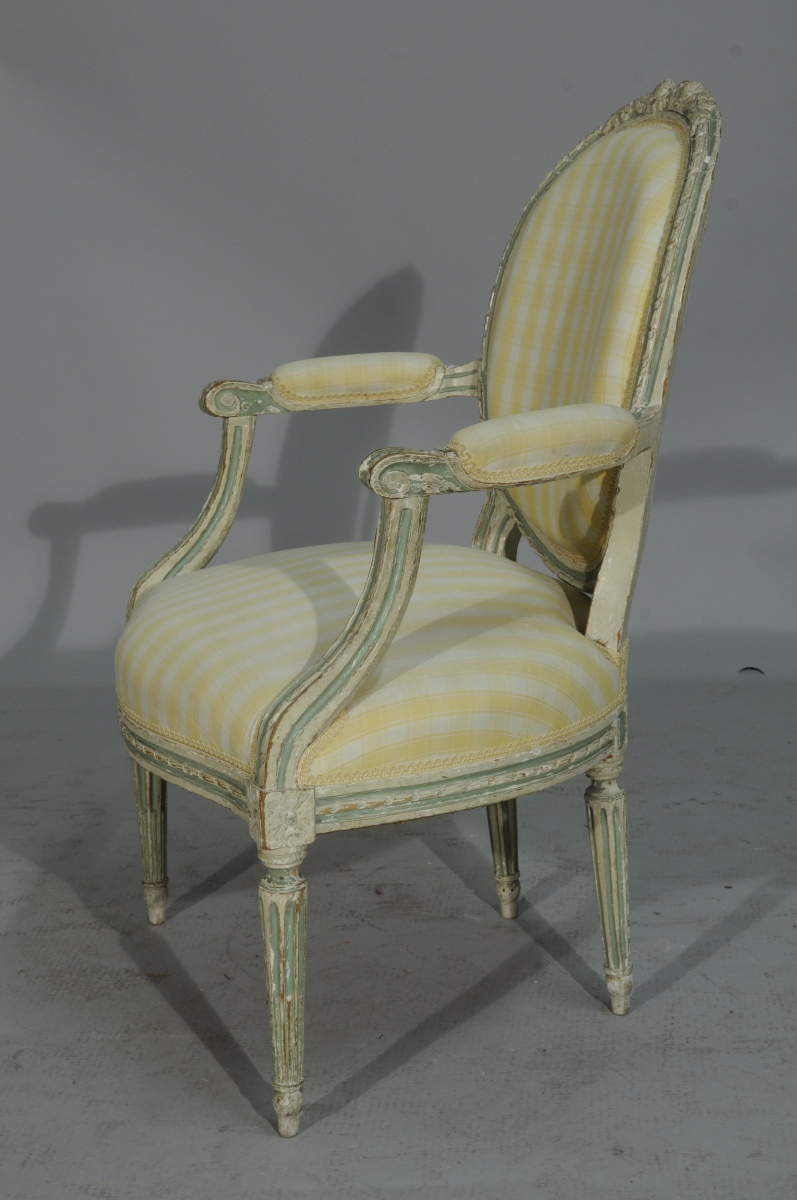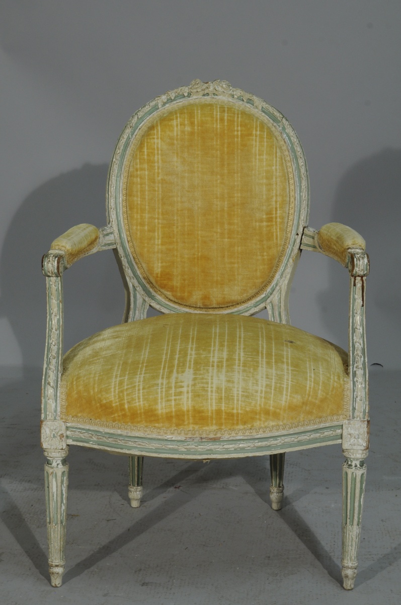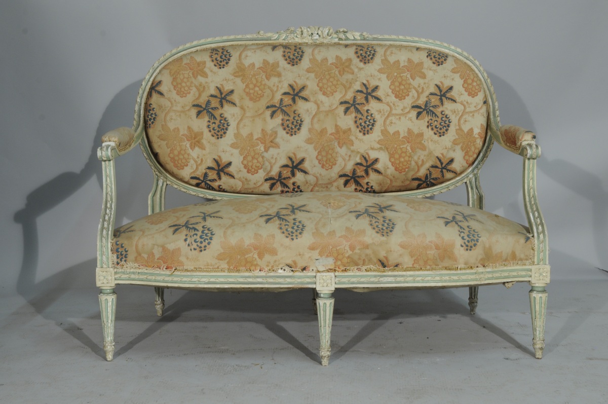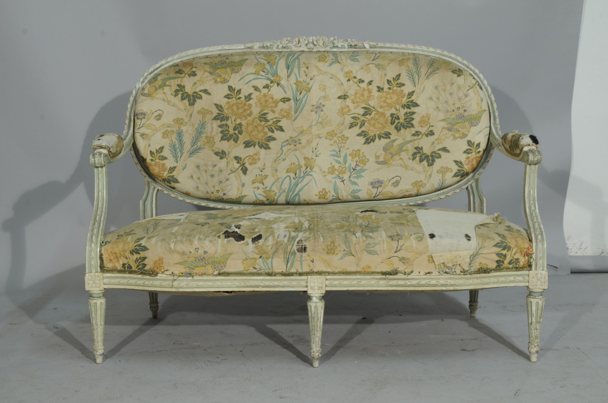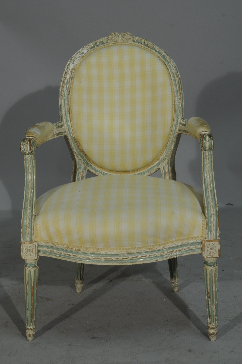 IMPORTANT SALON à dossier médaillon de 17 pièces comprenant : deux canapés, deux bergères, huit fauteuils cabriolets et cinq chaises en hêtre mouluré, sculpté et rechampi vert et crème. Accotoirs se terminant en volutes, et reposant sur des consoles galbées. Dés de raccordement sculptés de fleurons. Pieds fuselés et cannelés. Montants et traverses sculptés de rubans. Dossier sculpté d'une gerbe de roses et de feuillages noués.