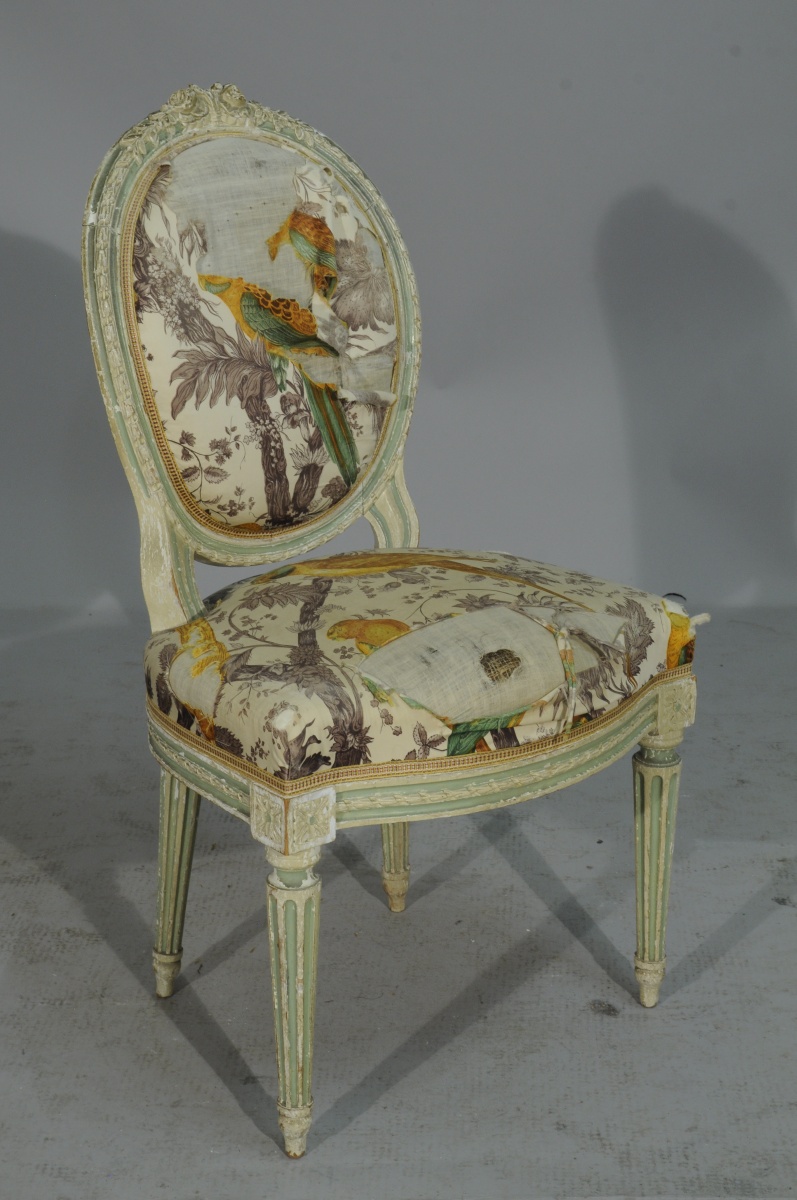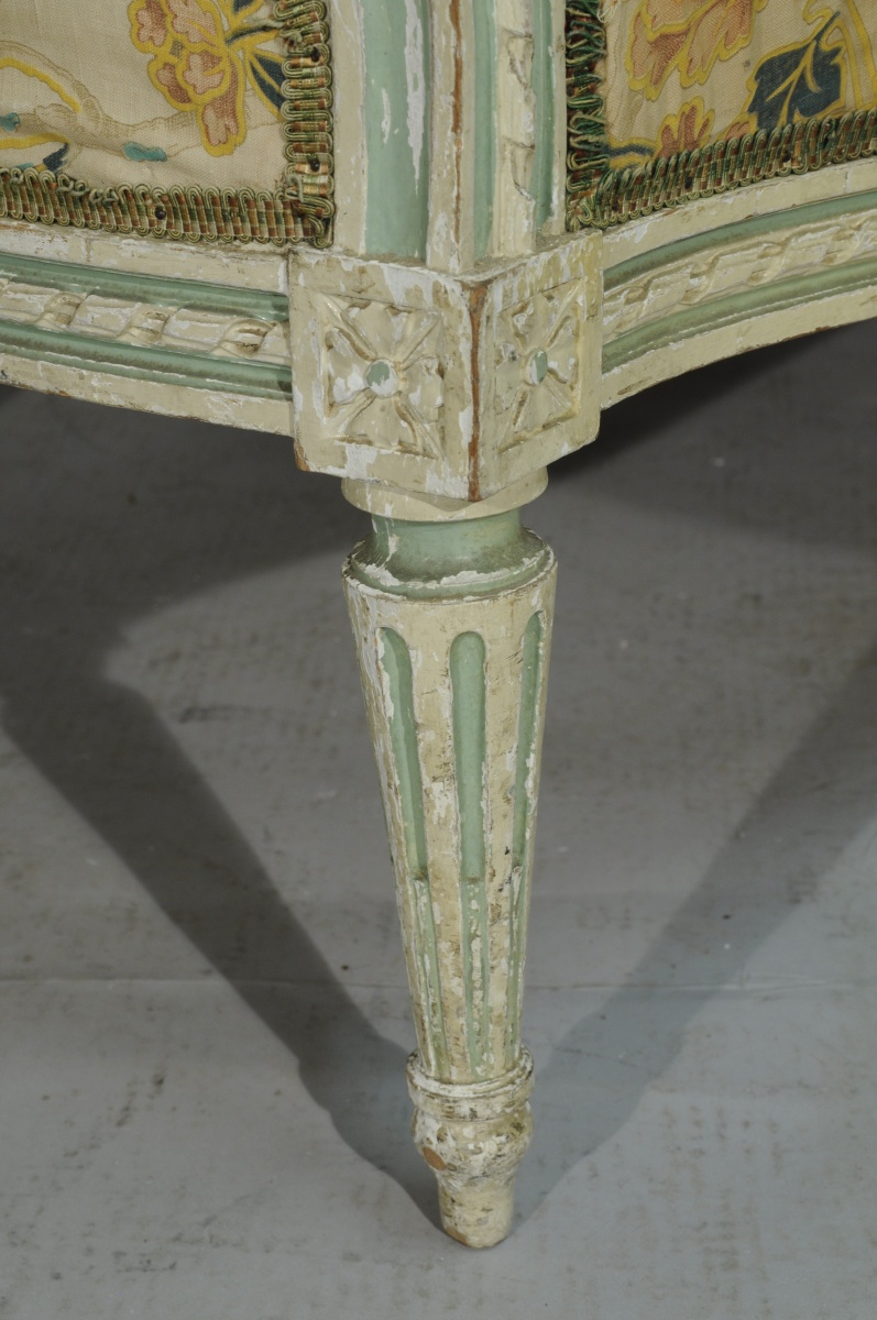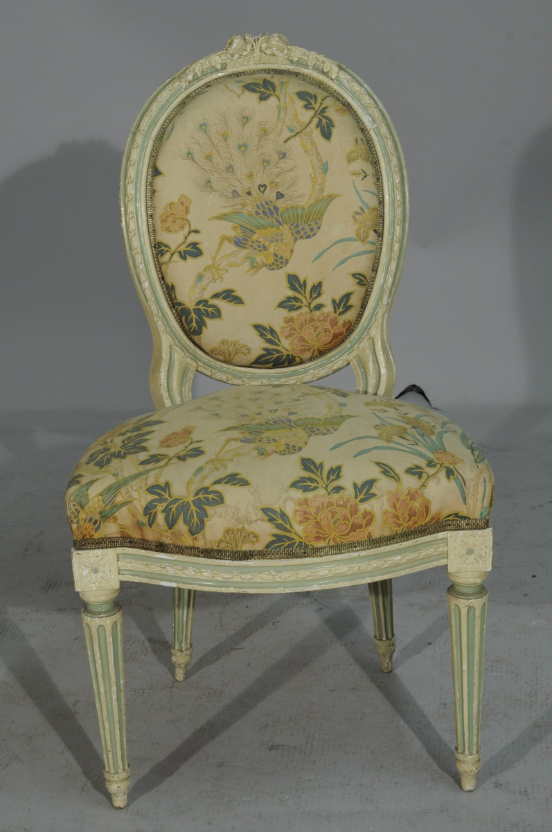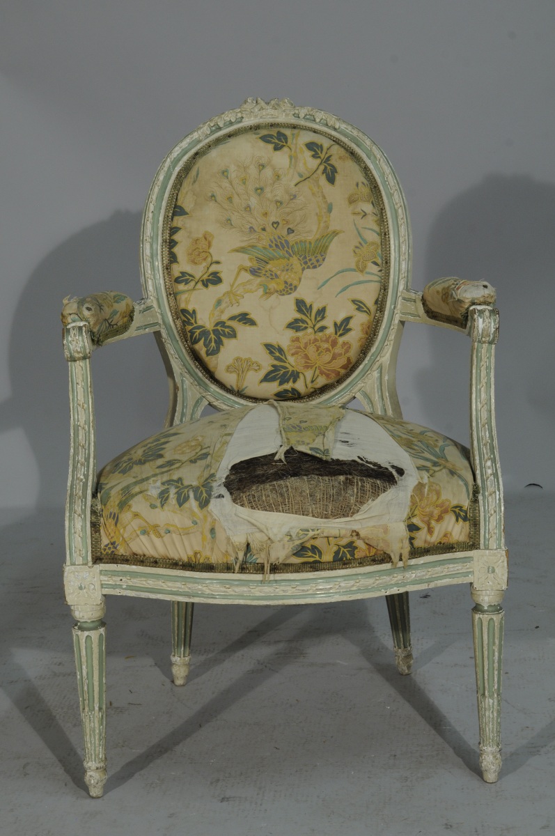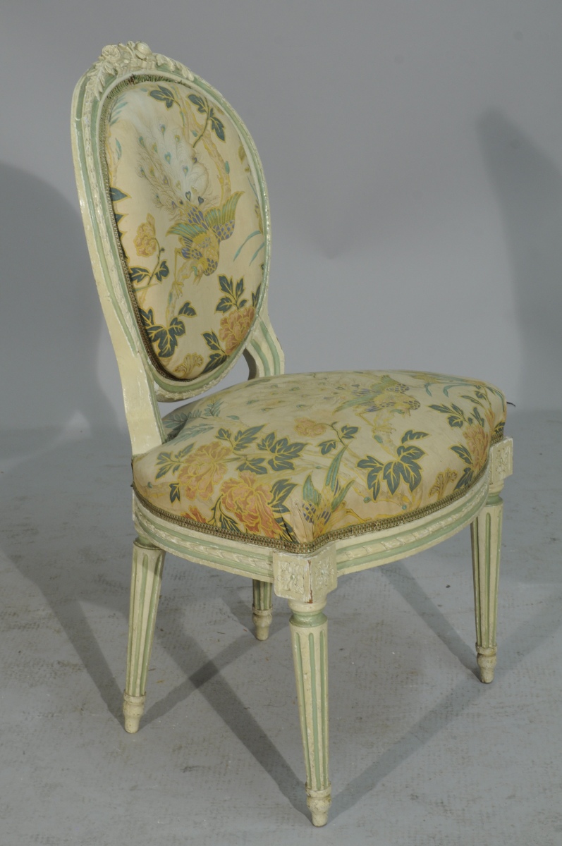 IMPORTANT SALON à dossier médaillon de 17 pièces comprenant : deux canapés, deux bergères, huit fauteuils cabriolets et cinq chaises en hêtre mouluré, sculpté et rechampi vert et crème. Accotoirs se terminant en volutes, et reposant sur des consoles galbées. Dés de raccordement sculptés de fleurons. Pieds fuselés et cannelés. Montants et traverses sculptés de rubans. Dossier sculpté d'une gerbe de roses et de feuillages noués.