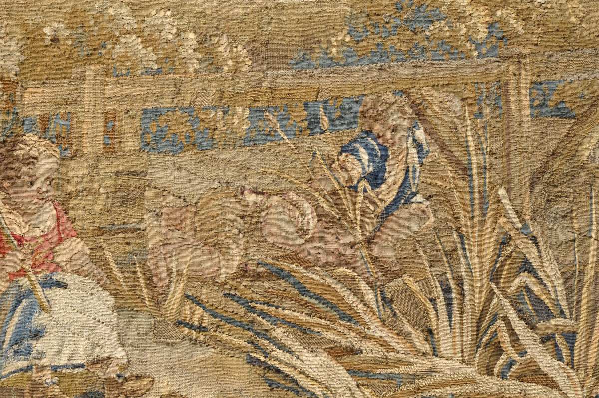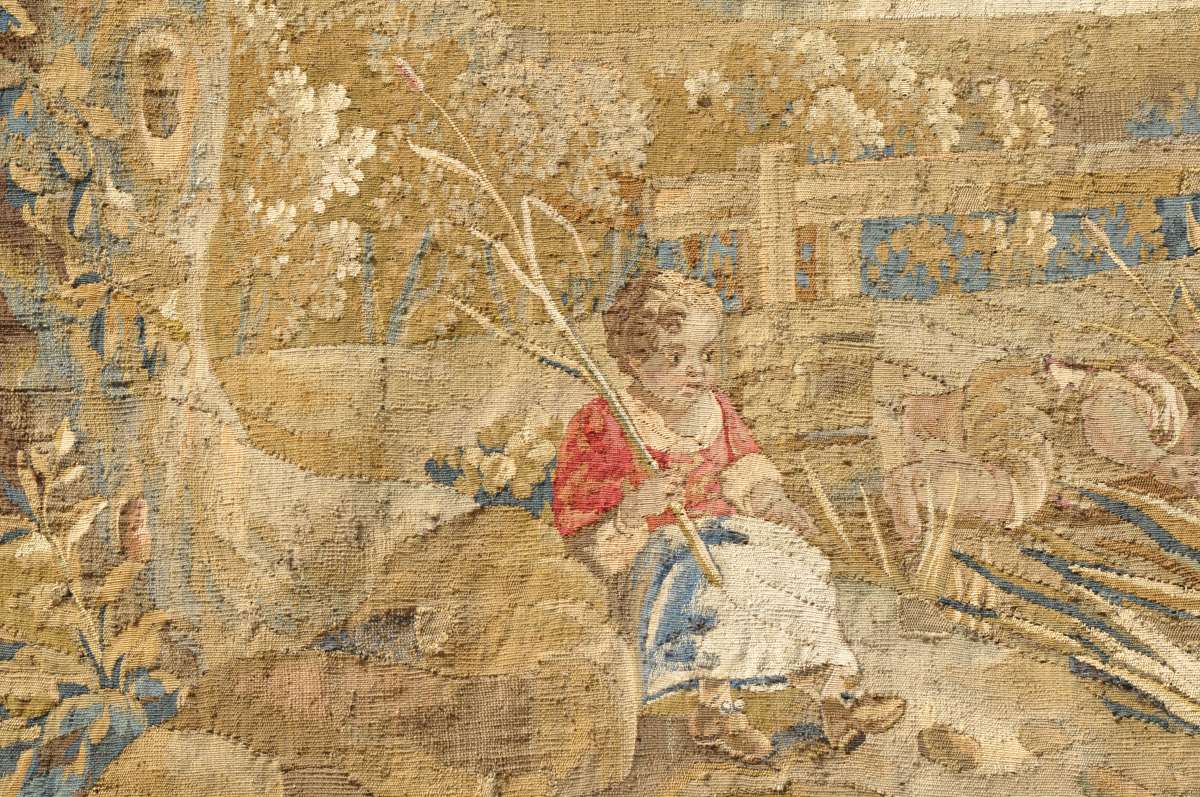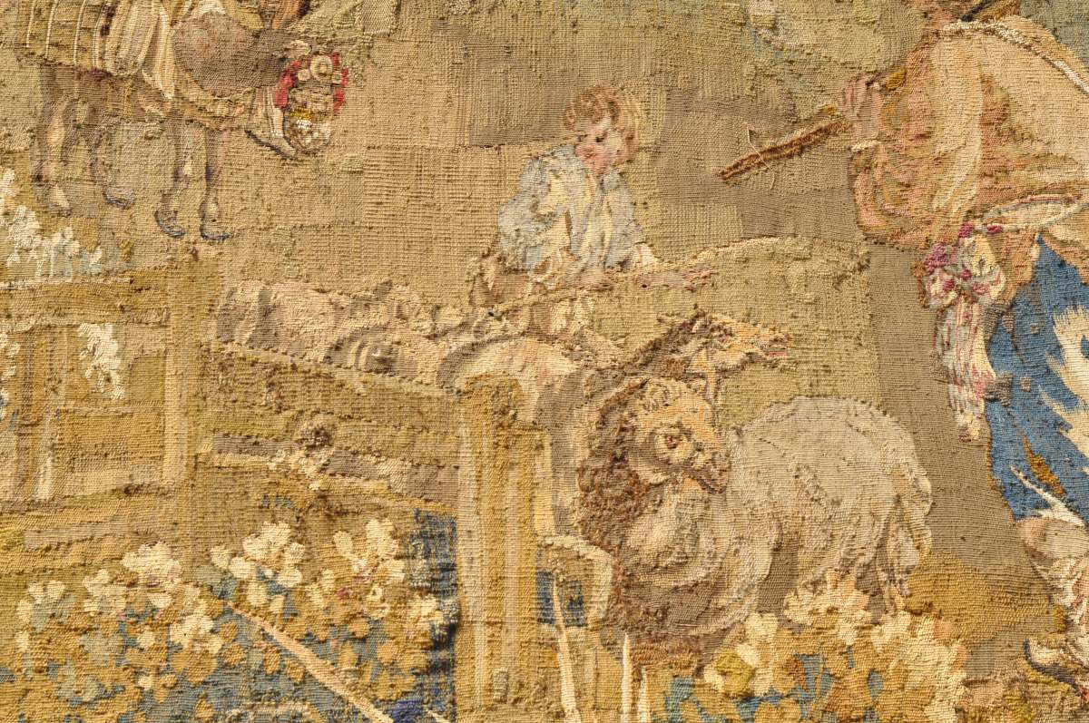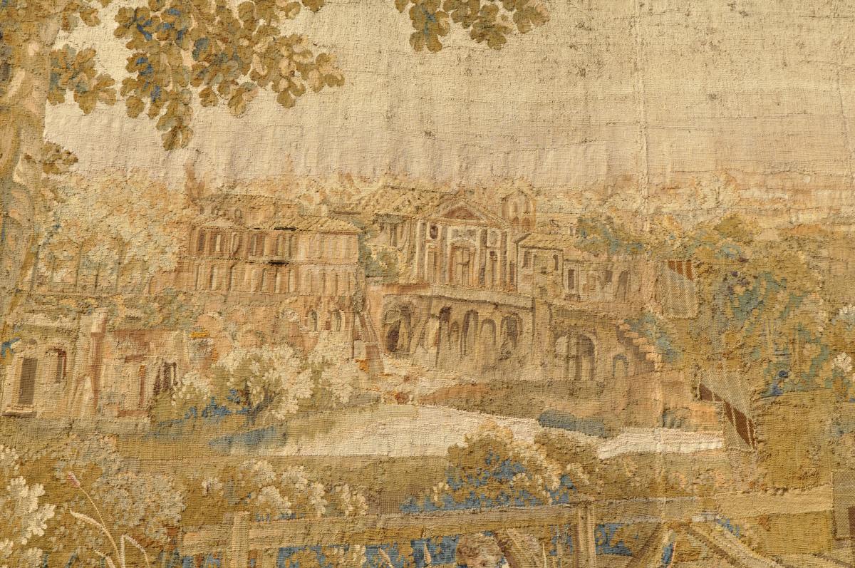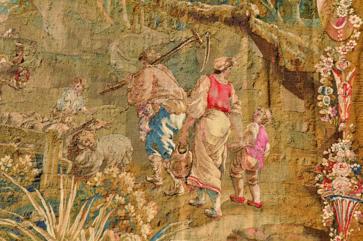Scène rurale représentant des paysans et leurs bêtes rentrant des champs dans un paysage de verdure architecturé. Au premier plan, un pont de bois.