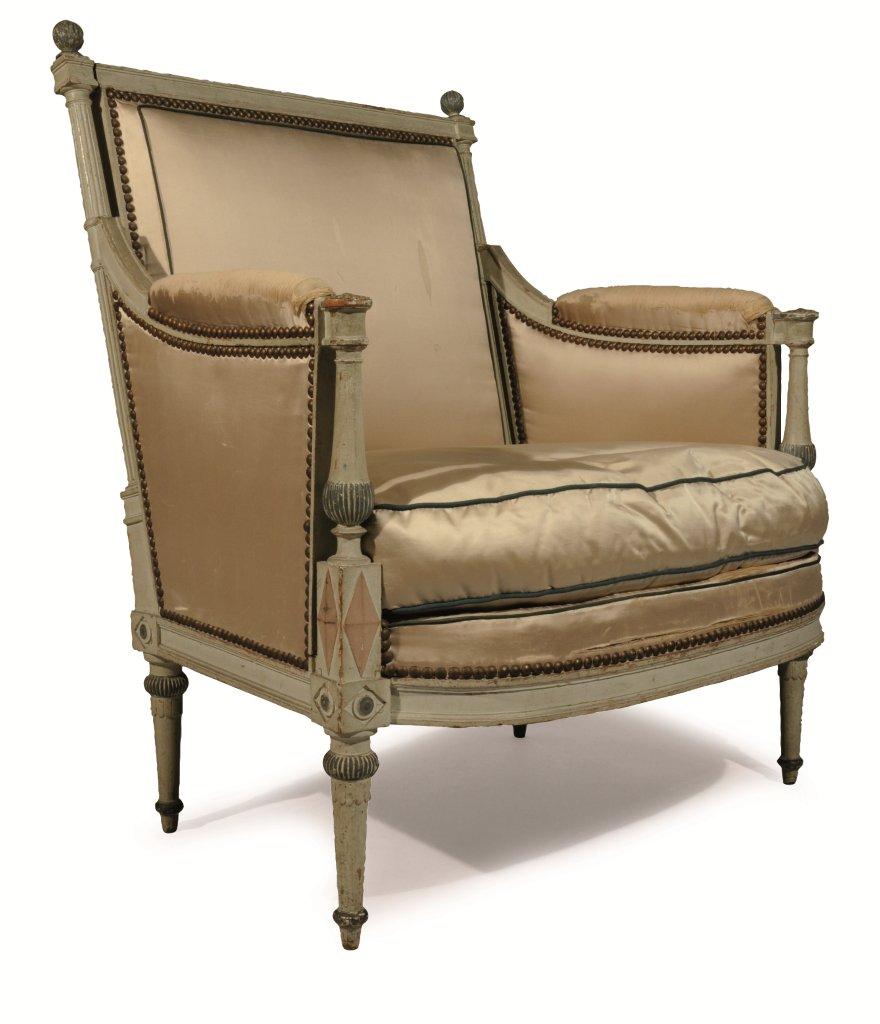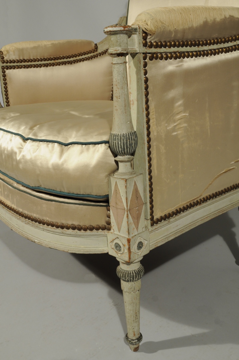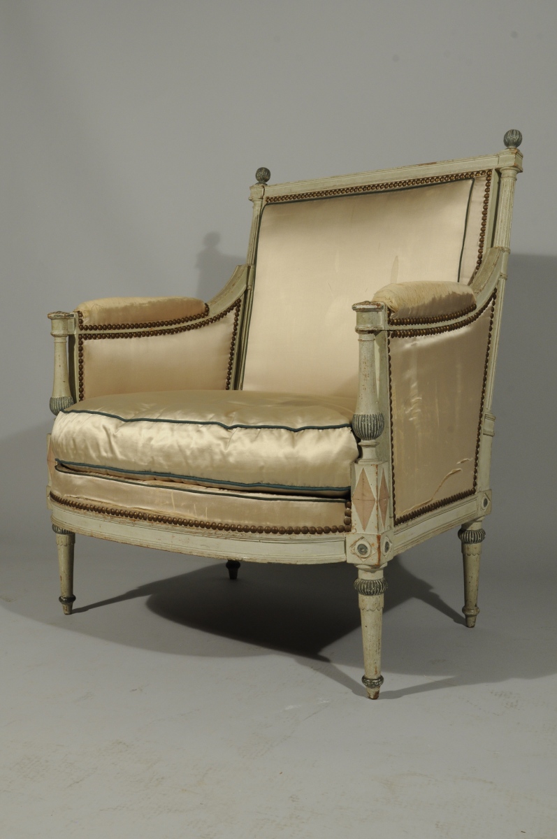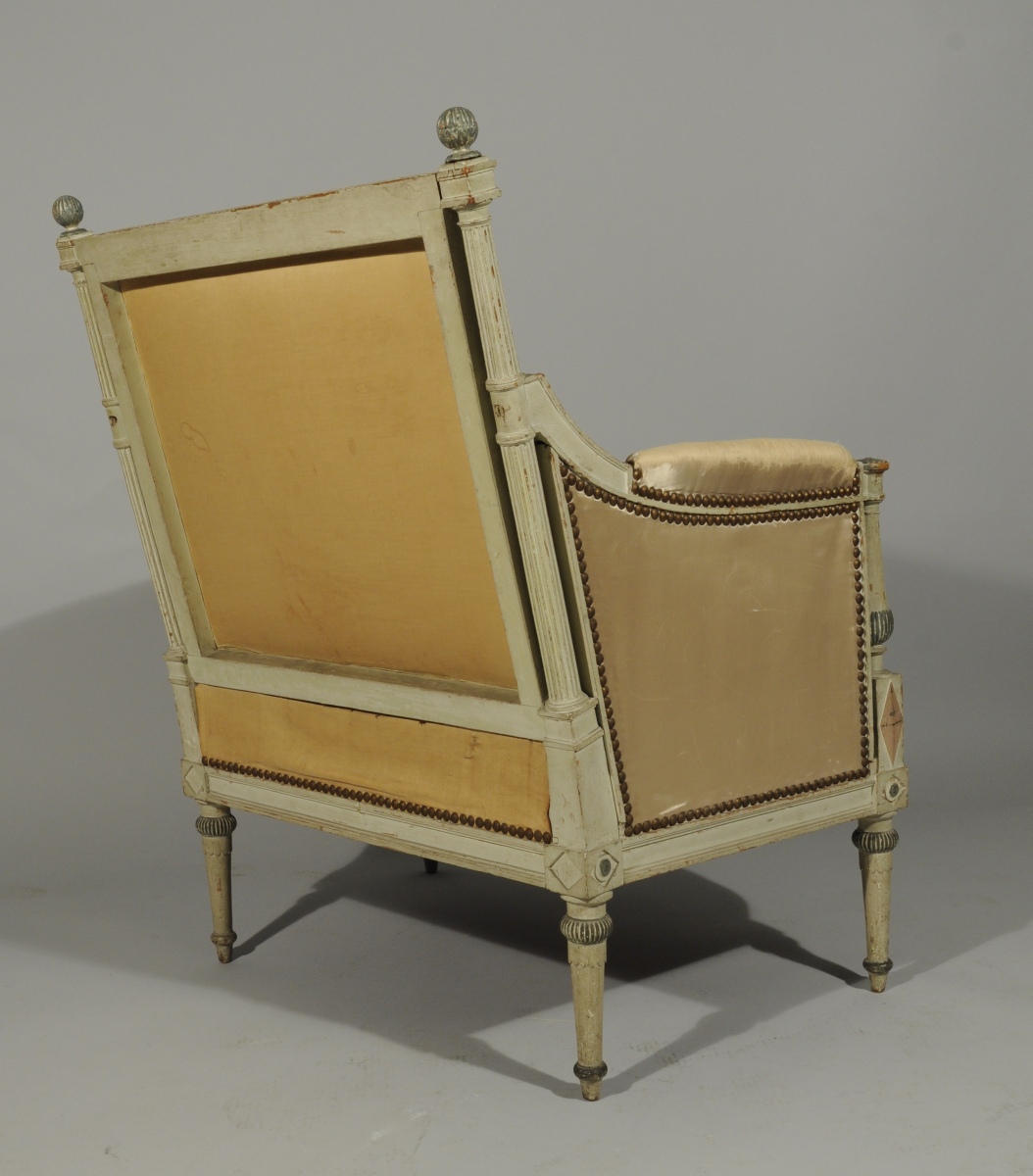 BERGÈRE en hêtre mouluré, sculpté et laqué gris. Dossier plat à colonnes cannnelées détachées, grenades éclatées à l'amortissement. Consoles d'accotoir de forme balustre ornées de marguerites et godrons. Dés de raccordement ornés de losanges. Pieds fuselés.