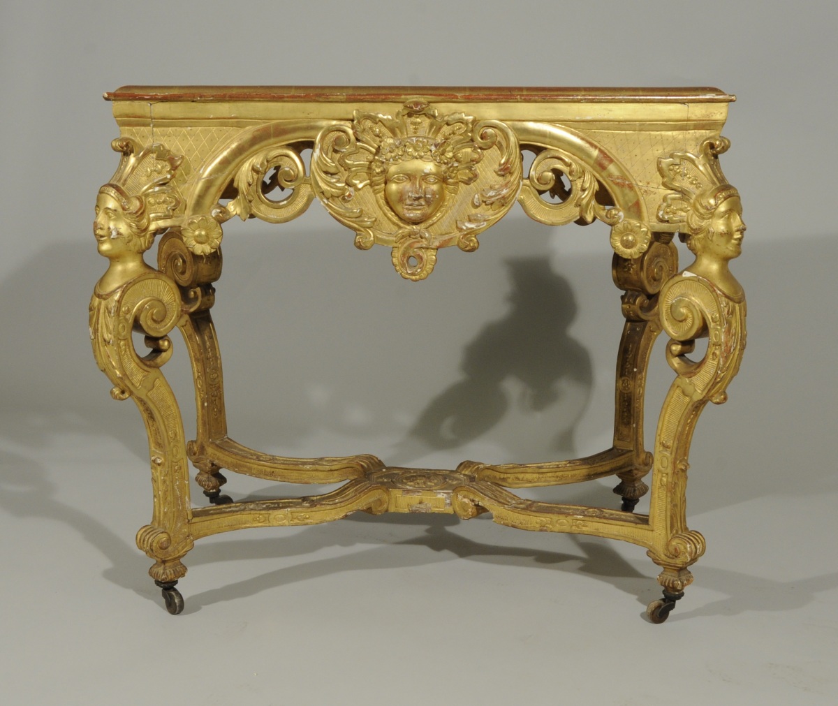 Elle repose sur quatre pieds en console surmontés de buste de femme souriante et reliés par une entretoise en X. La ceinture ornée d'un mascaron féminin sur fond ajouré de feuilles d'acanthes, volutes et fleurettes.