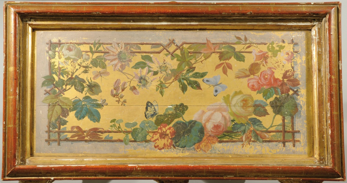 Le plateau est peint d'une composition naturaliste polychrome sur fond doré. Montée sur roulettes.