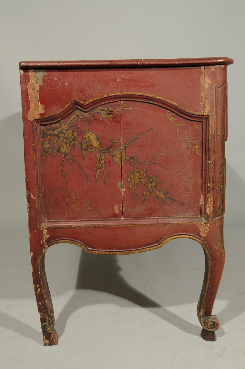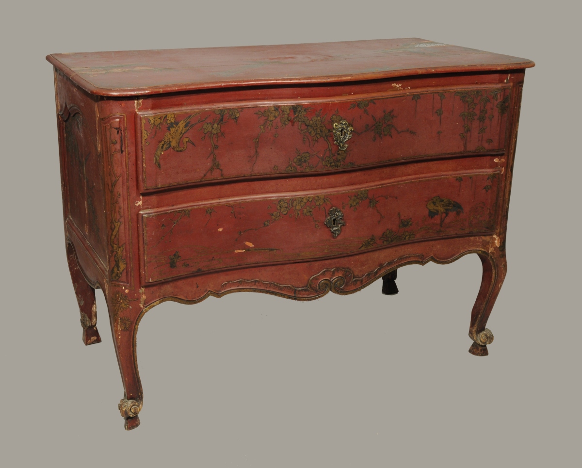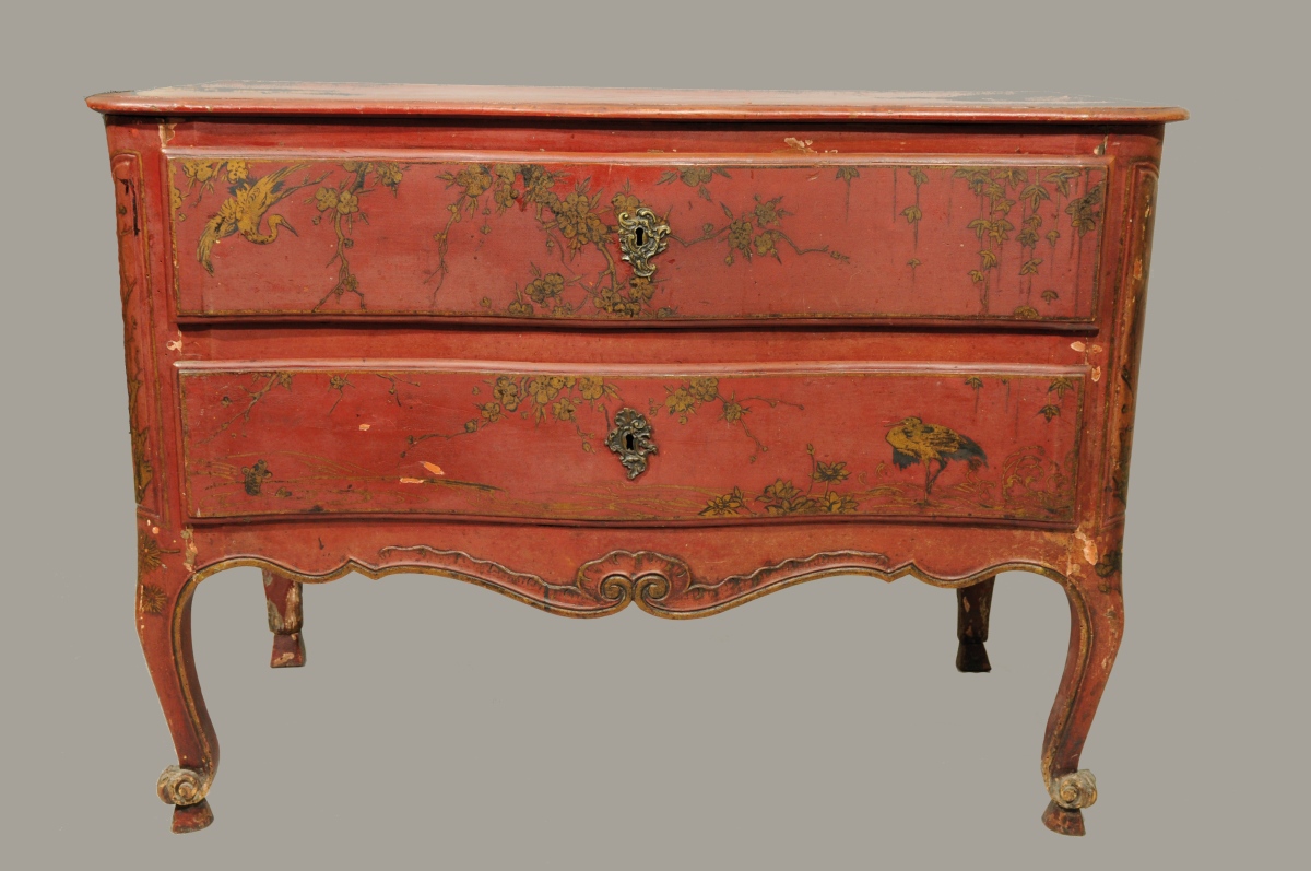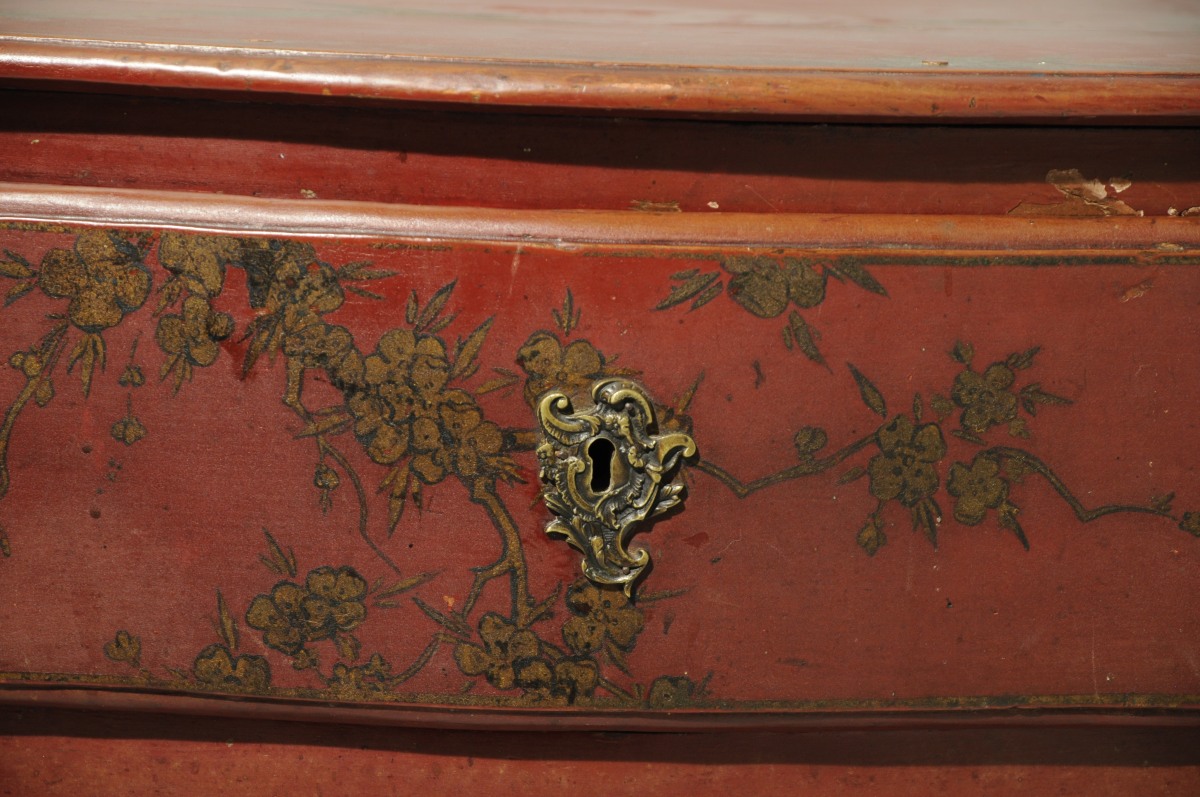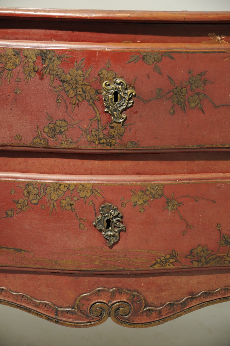 COMMODE mouvementée en pin mouluré, sculpté et laqué rouge. Décor à l'imitation du laque, de grues et de carpes dans un paysage lacustre. Elle ouvre à deux tiroirs en façade. Montants moulurés. Traverse mouvementée et sculptée de volutes affrontées et coquilles. Pieds cambrés terminés par des volutes et bouts de pieds en sabot. Entrées de serrure en bronze doré de style rocaille.
