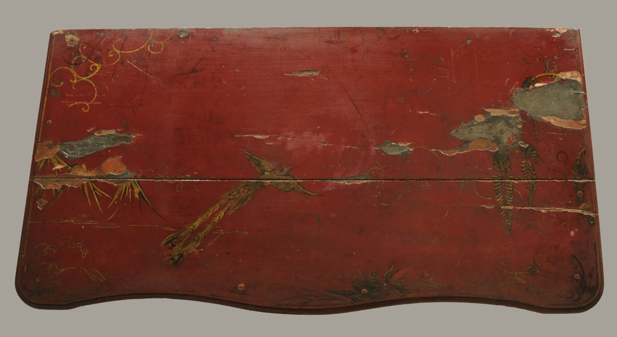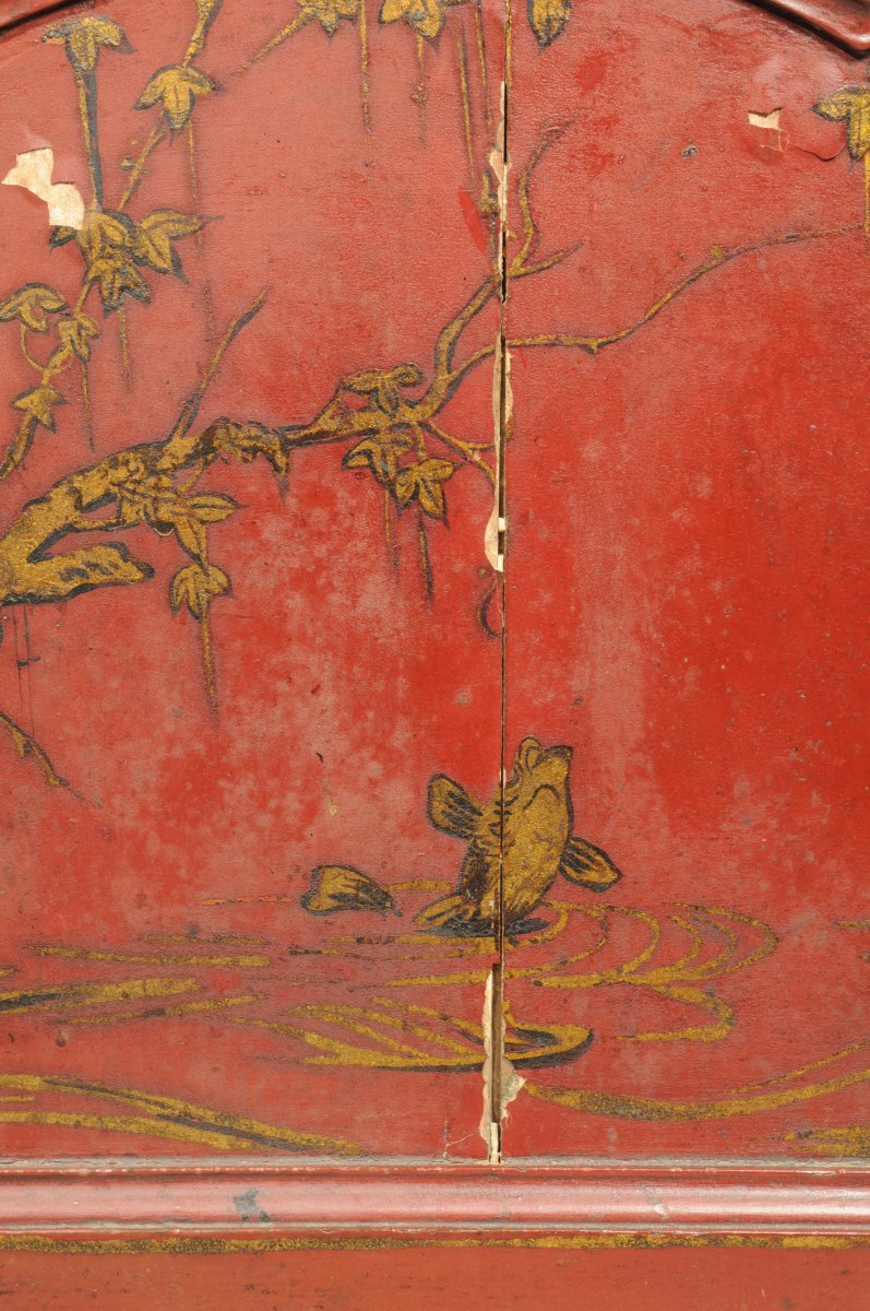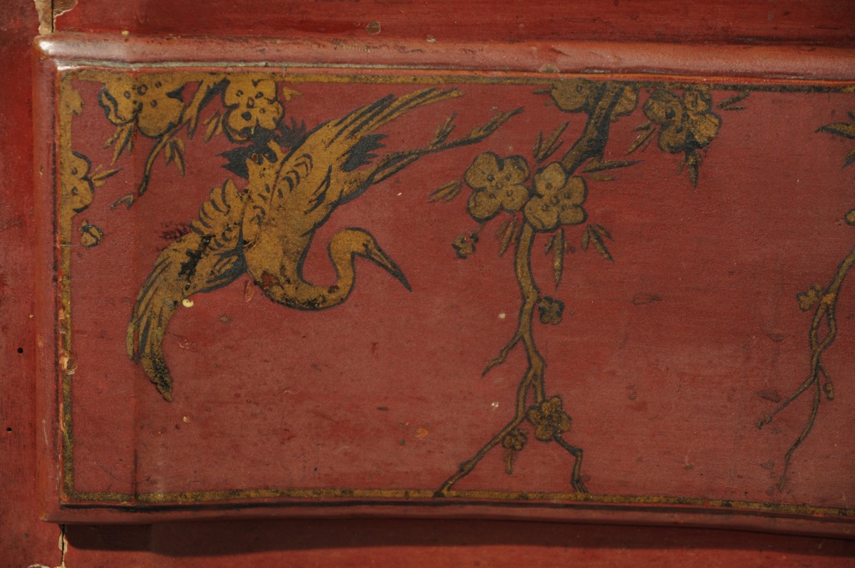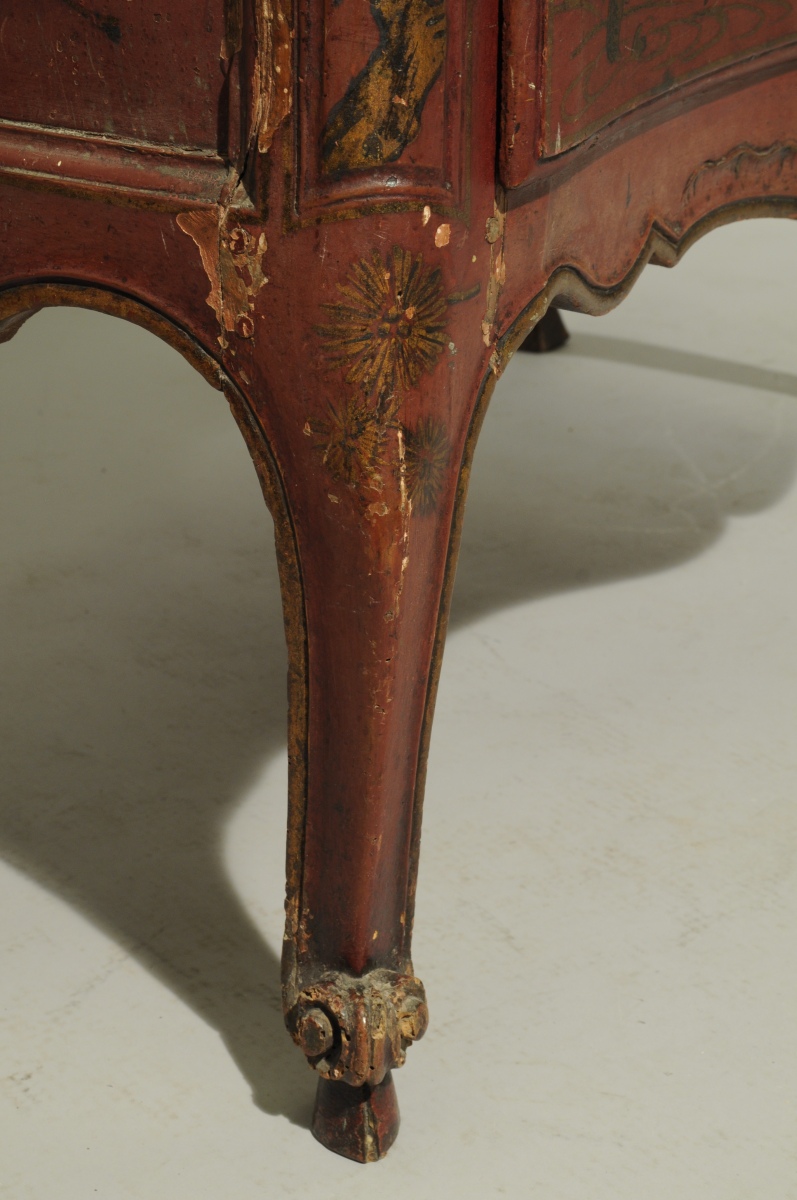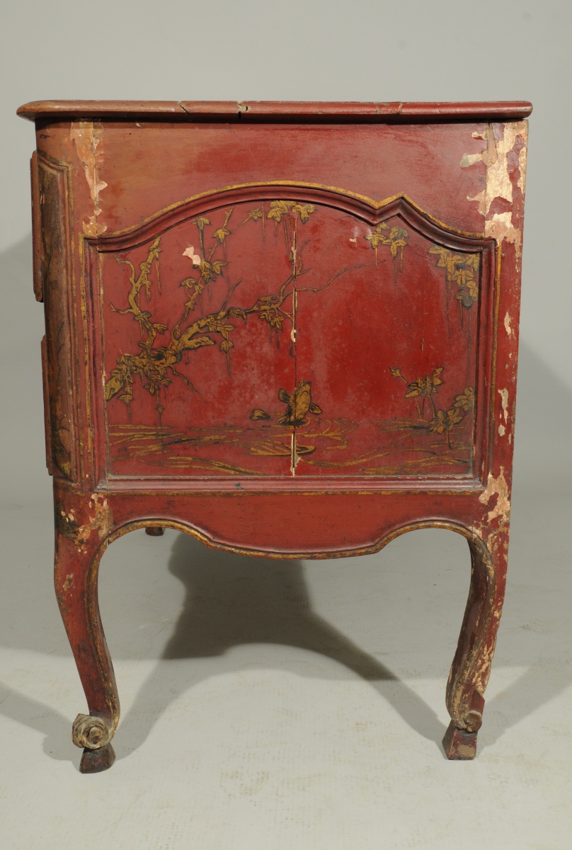 COMMODE mouvementée en pin mouluré, sculpté et laqué rouge. Décor à l'imitation du laque, de grues et de carpes dans un paysage lacustre. Elle ouvre à deux tiroirs en façade. Montants moulurés. Traverse mouvementée et sculptée de volutes affrontées et coquilles. Pieds cambrés terminés par des volutes et bouts de pieds en sabot. Entrées de serrure en bronze doré de style rocaille.
