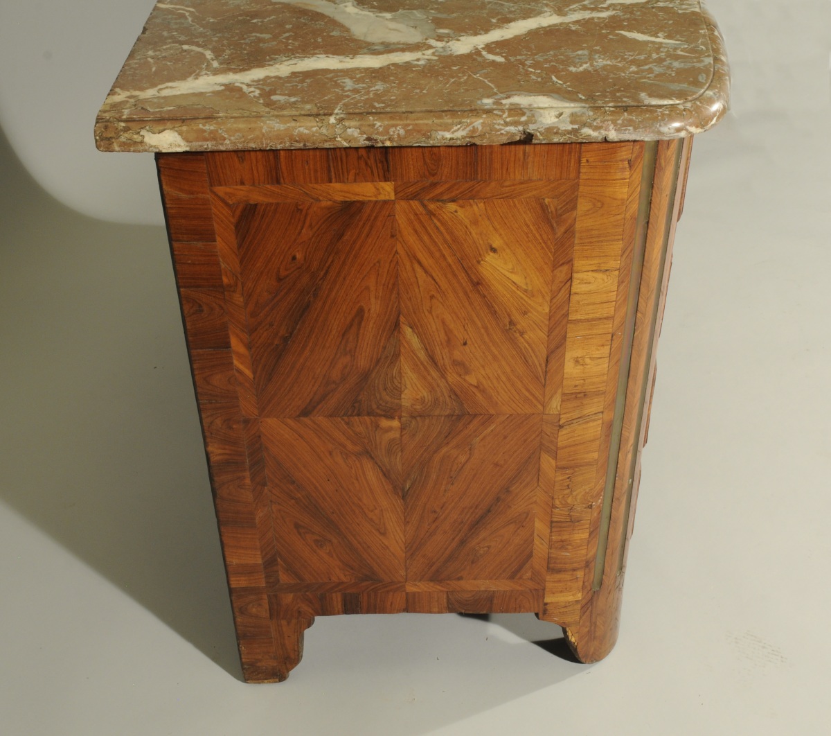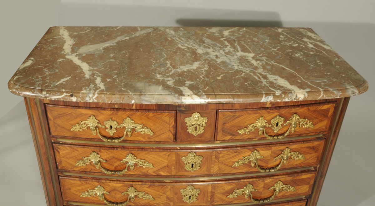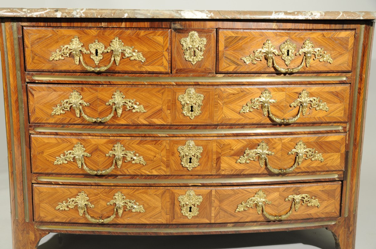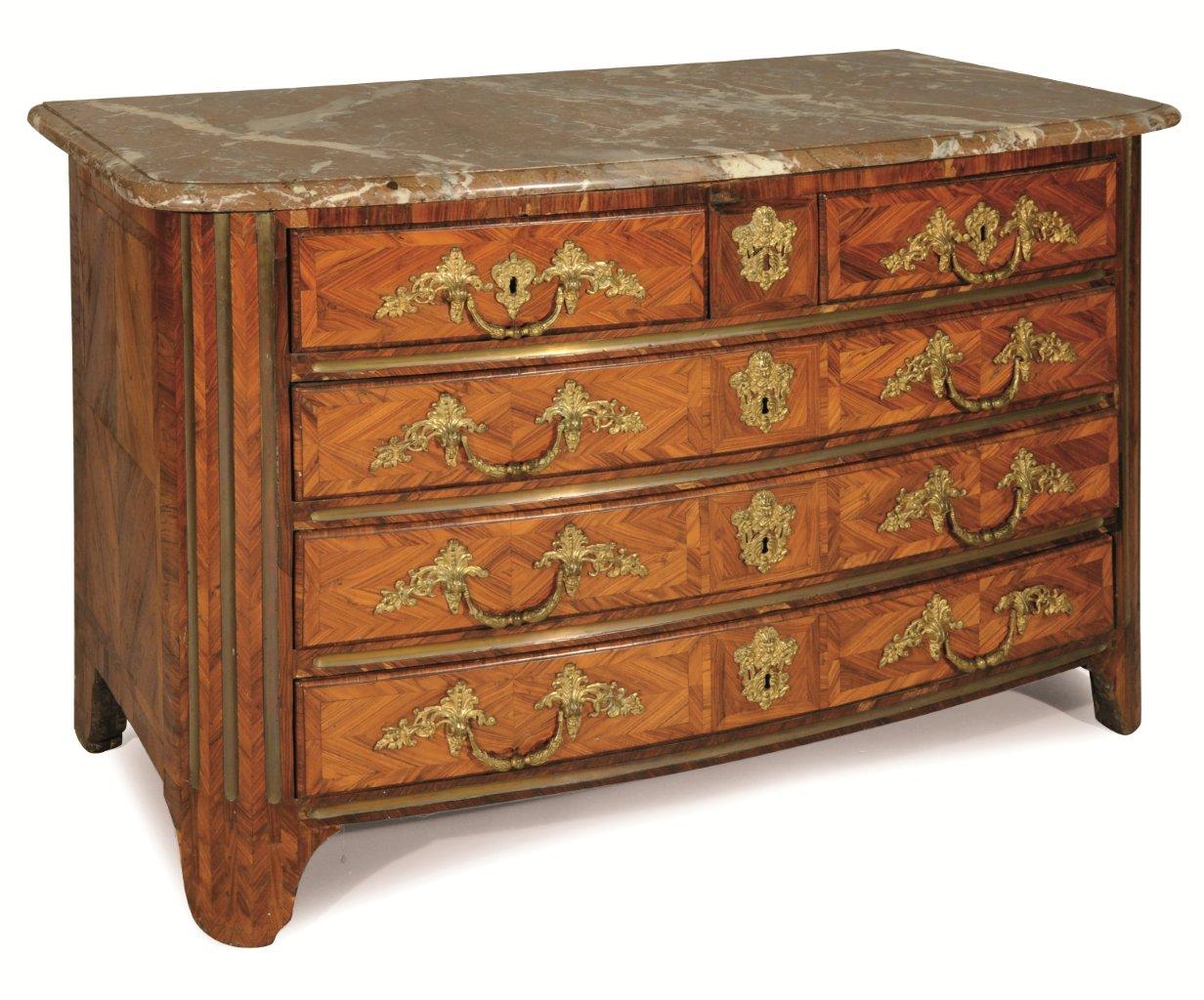 COMMODE en placage de bois de rose en frisage. Elle ouvre à cinq tiroirs sur quatre rangs. La cannelure triglyphe des montants est garnie en laiton. Elle repose sur quatre pieds ; les pieds antérieurs arrondis tombent dans le prolongement des montants.
