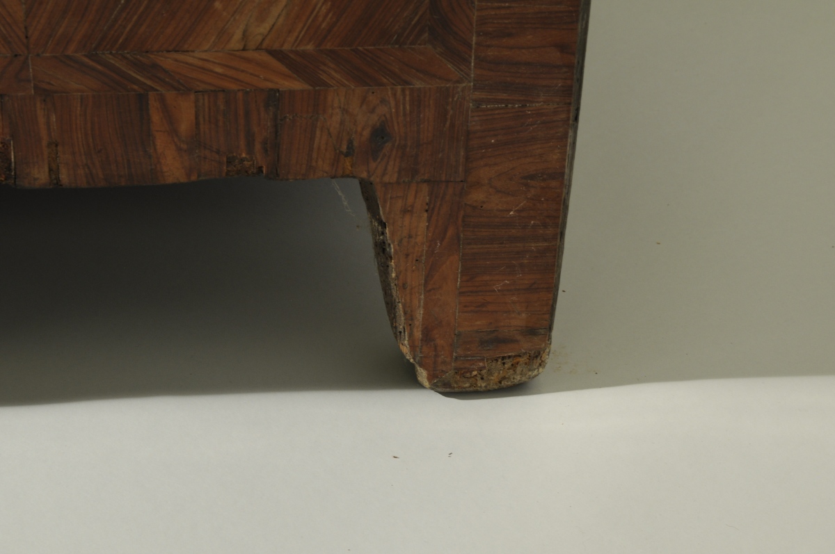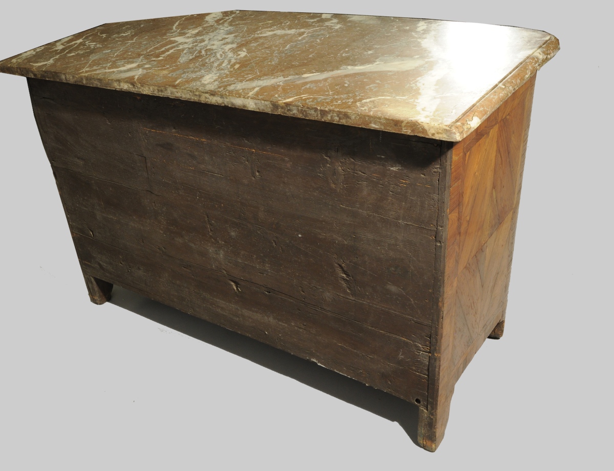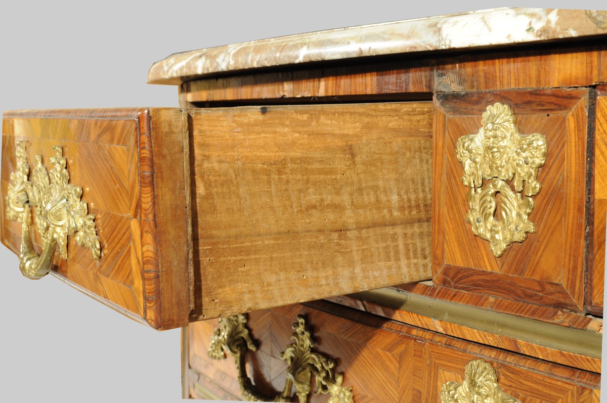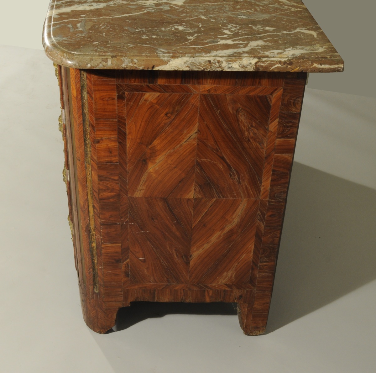 COMMODE en placage de bois de rose en frisage. Elle ouvre à cinq tiroirs sur quatre rangs. La cannelure triglyphe des montants est garnie en laiton. Elle repose sur quatre pieds ; les pieds antérieurs arrondis tombent dans le prolongement des montants.