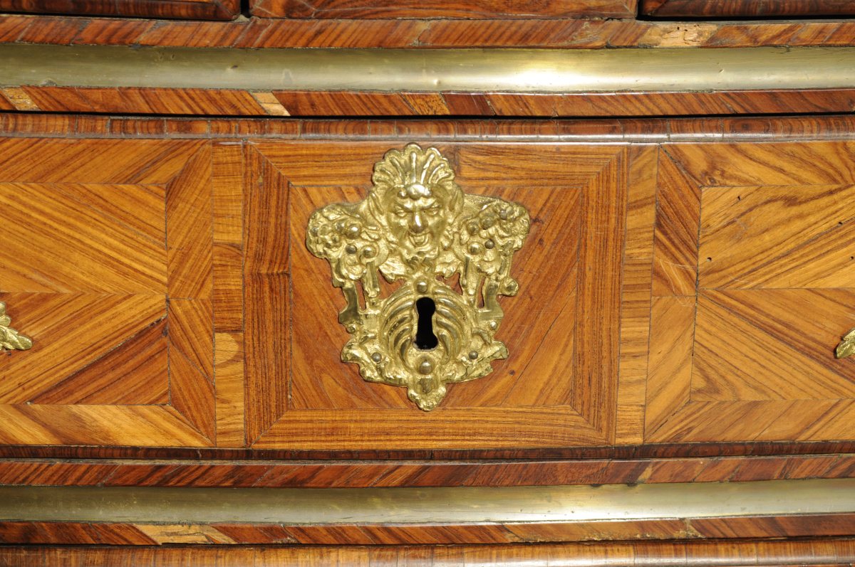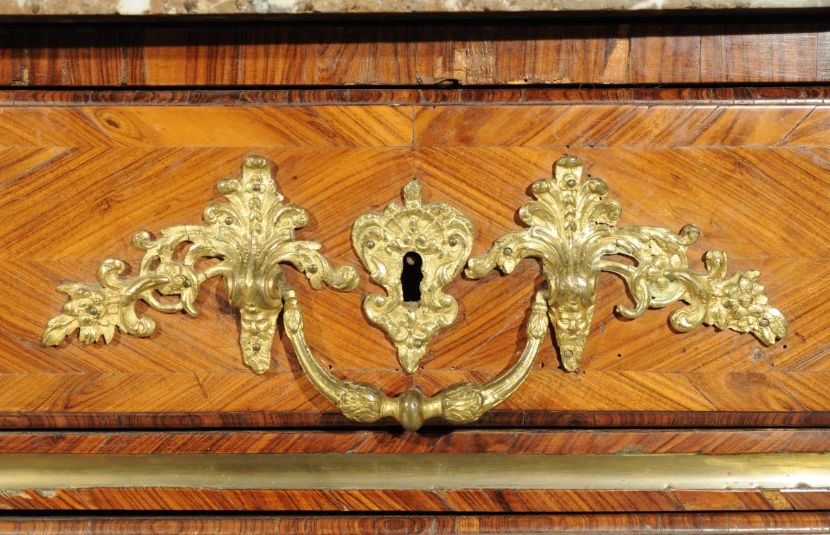 Poignées tombantes et entrées de serrure ornées de mascarons et de feuillages en bronze doré.