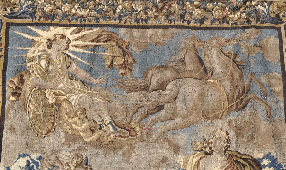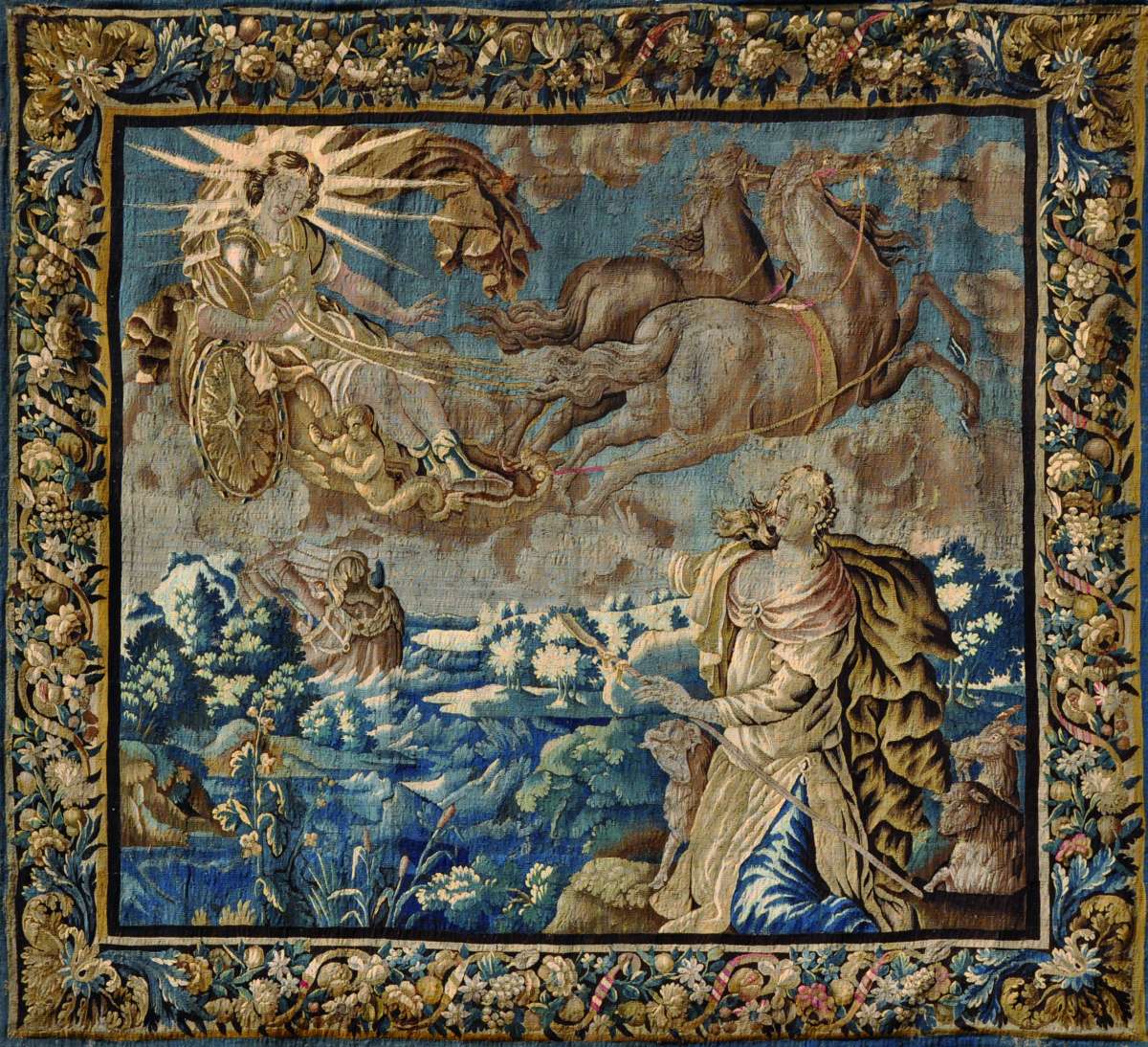 Scène mythologique représentant le Char du Soleil mené par Apollon au-dessus des flots. Sur la rive, Cyrène, fille du roi des Lapithes, le contemple. Bordure de rinceaux feuillagés, fleurs et fruits.