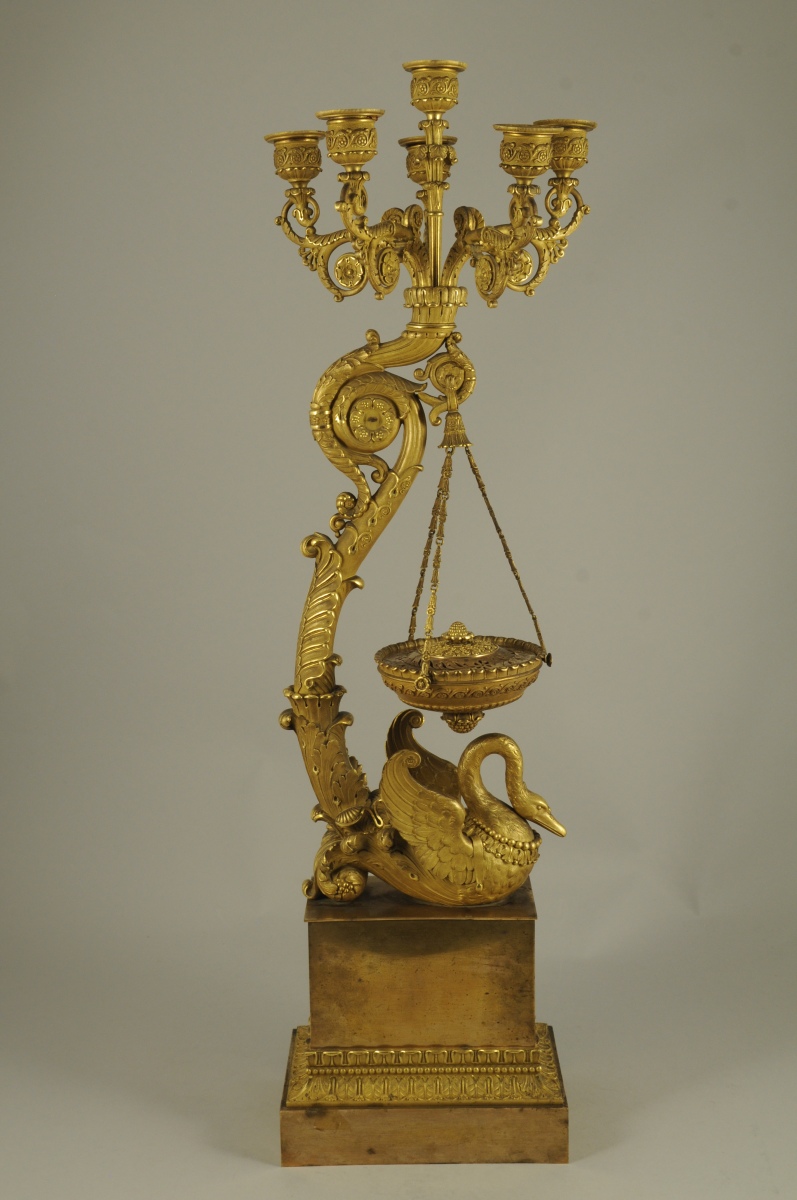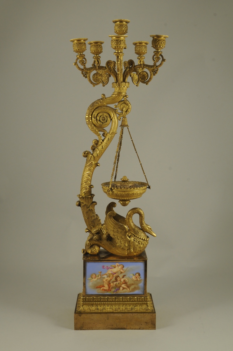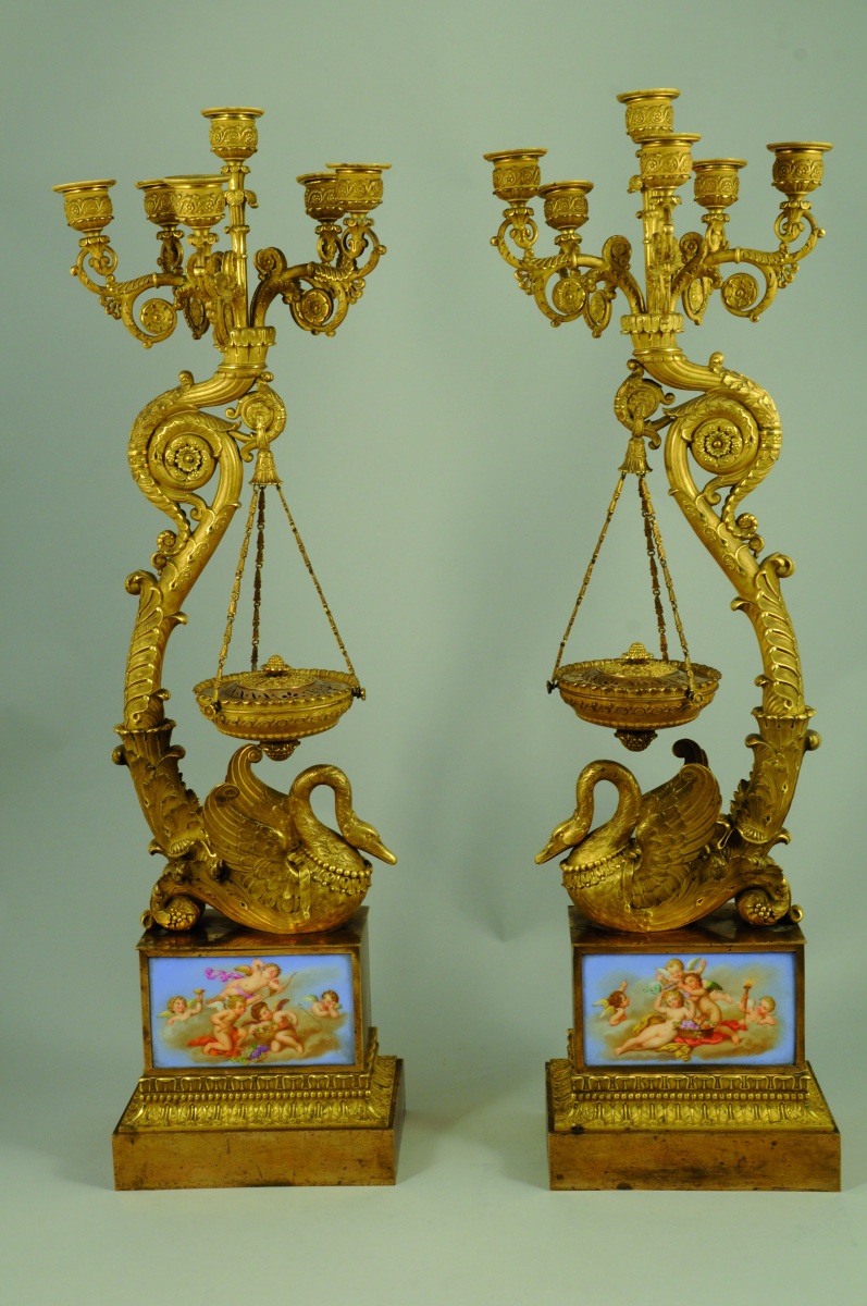 Rare PAIRE de CANDÉLABRES BRÛLE-PARFUMS AUX CYGNES en bronze ciselé et doré, à plaques de porcelaine.