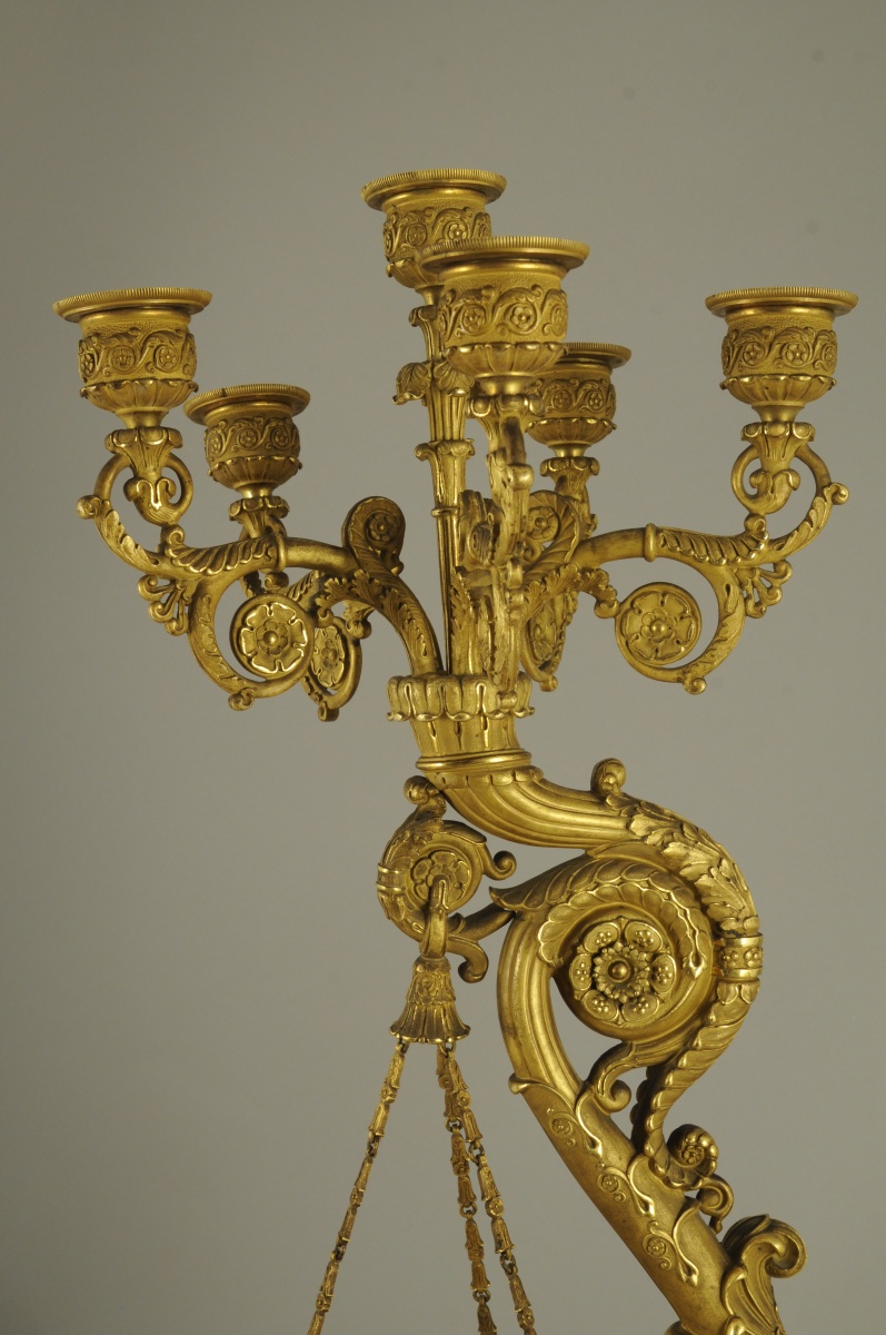 Une corne d'abondance en bronze, prend appui sur l'enroulement des palmes, pour donner naissance à cinq bras de lumières et, à un feu central, formant candélabre. Riches ciselures de rinceaux et feuillages.