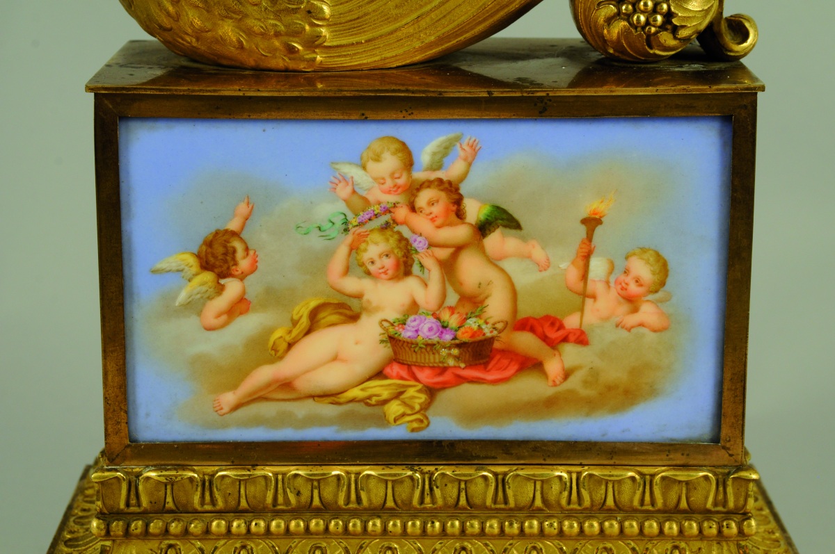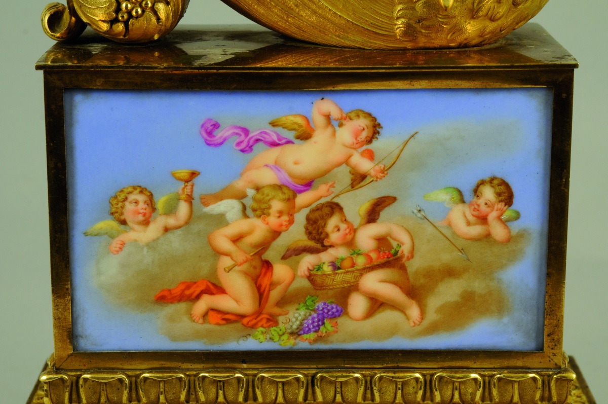Deux plaques de porcelaine au motif des amours de Vénus, sur un nuage, sont enchâssées sur un socle rectangulaire en tôle à frise de lotus, fleurettes et rang de perles. L'une figure une jeune déesse couronnée par quatre amours présentant un panier fleuri et une torche enflammée. L'autre figure Cupidon décochant une flèche, entouré de quatre amours : rêveur, à la coupe, au panier de fruits et à la flûte.