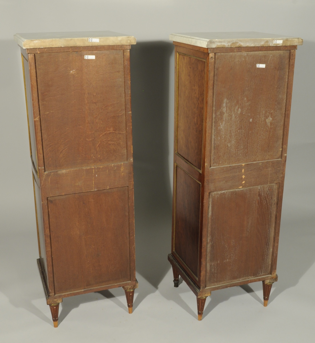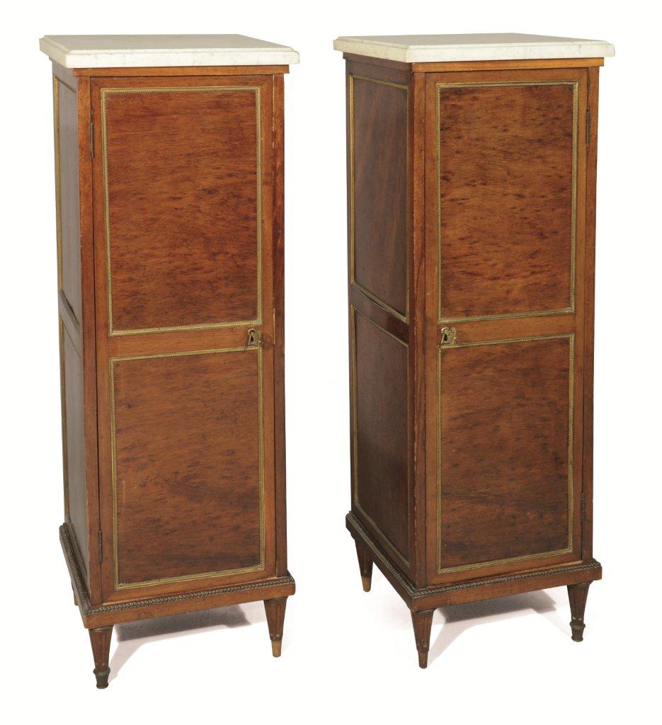 PAIRE de PETITES ARMOIRES en acajou et placage d'acajou mouluré. Encadrements de filets à rangs de perle, entrées de serrures et sabots en bronze doré. Pieds fuselés et cannelés. Dessus de marbre gris clair.