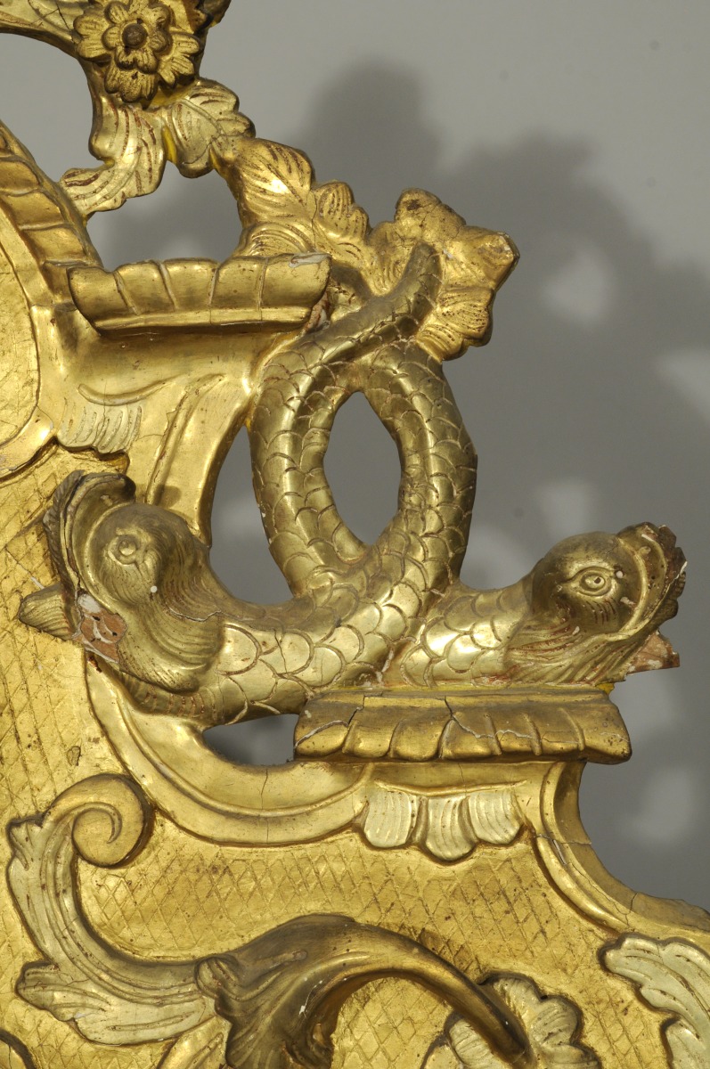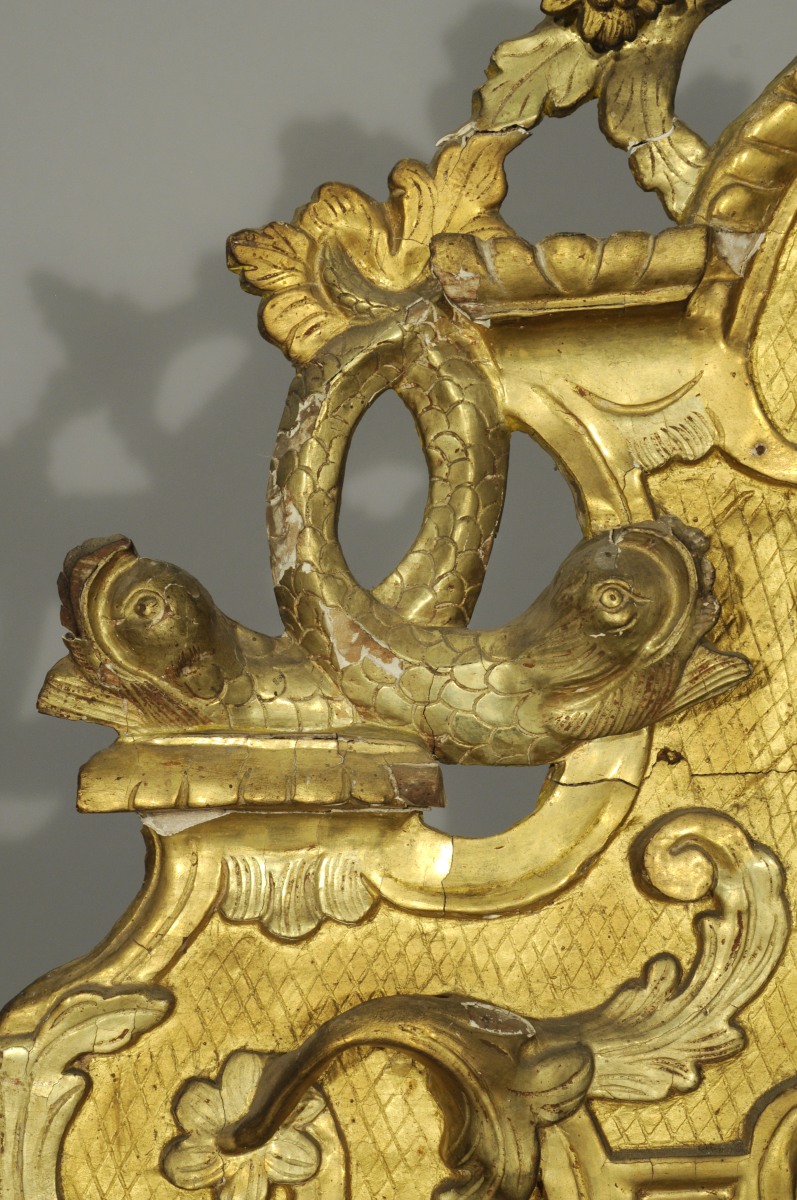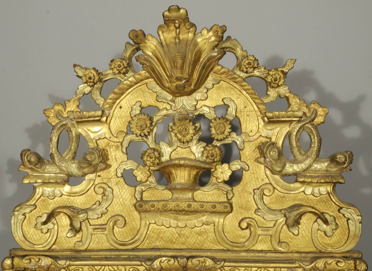 MIROIR en bois doré et argenté. Fronton au panier fleuri et dauphins stylisés enlacés par la queue. Panaches, acanthes. Glace au mercure.
