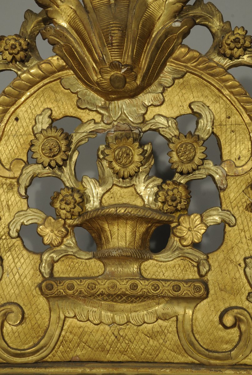 MIROIR en bois doré et argenté. Fronton au panier fleuri...