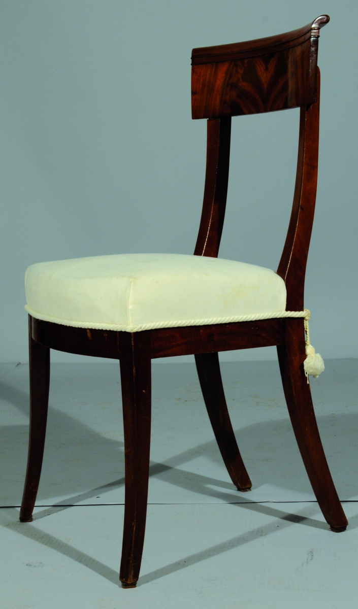 SUITE DE HUIT CHAISES en acajou. Dossier bandeau souligné de deux nervures. Pieds en sabre.