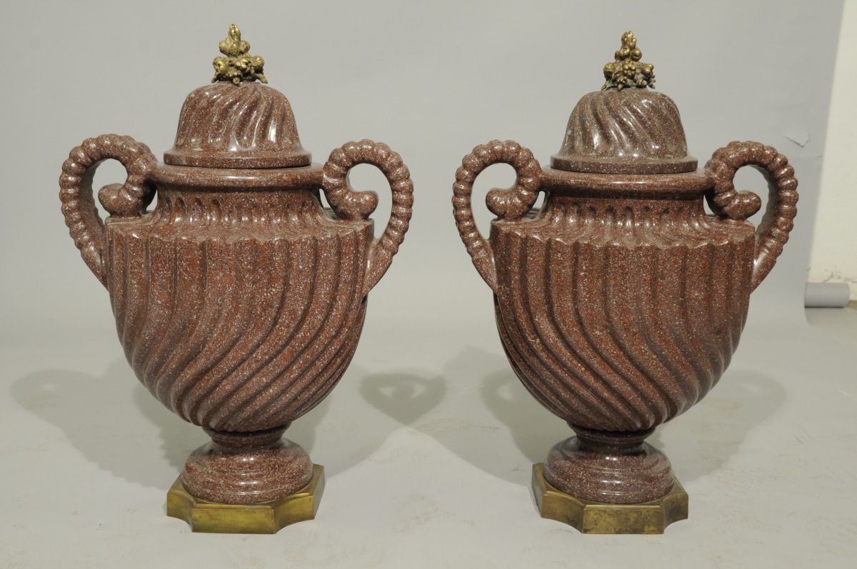 Paire de VASES COUVERTS en porphyre rouge, ou en quartzite, à côtés torses inversées, en forme d'urne à panse et col à décor de godrons creux spiralés à anses doubles annelées terminées en pinces de homard et reposant sur des bases à piédouche. Couvercles à godrons creux spiralés à côtes inversées. Socles quadrangulaire à pans évidés montés en bronze doré et boutons en fruits éclatés.