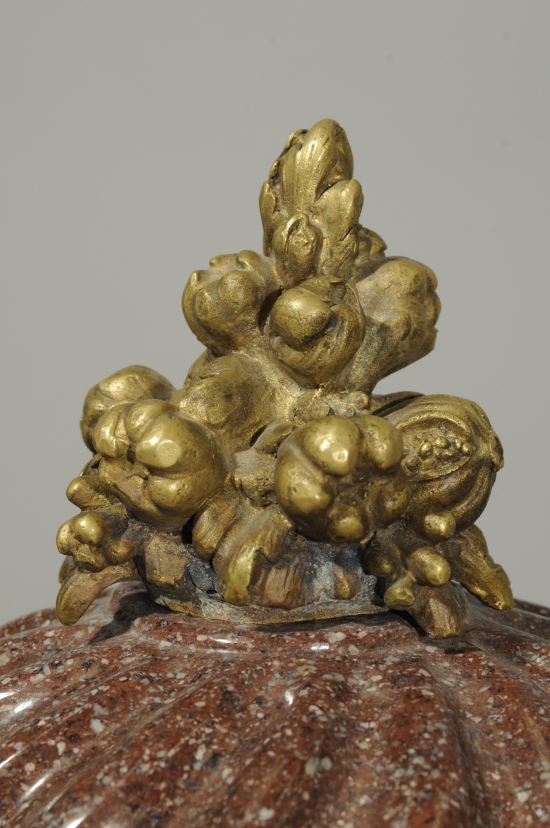 Le Cardinal de Richelieu obtient, en 1633, le permis d'exporter de Rome 122 statues et cinq vases, dont quatre en porphyre, pour orner la galerie de son château en Touraine. La paire de vases, dont s'inspire la nôtre, y aurait encadré un buste d'Alexandre. Richelieu commande le dessin de ses sculptures à Giovanni Angelo Canini, dont le recueil est conservé par le département des arts graphiques du Musée du Louvre. À la mort du Cardinal, ces vases sont achetés par Mazarin pour le roi Louis XIV. On retrouve cette paire de vases précisément décrite à Versailles, dans l'inventaire de 1722, avec ses pinces d'écrevisse ou de homard. Ils trônent dans l'enfilade triomphale de La Galerie des Glaces et des deux salons qui la jouxte : celui de la Guerre et de la Paix. 36 vases de porphyre, en paire, alternent avec 17 vases d'albâtre, dans une débauche royale de pierres pourpres dures et de pierres blanches tendres. Ces vases sont aujourd'hui conservés par le Musée du Louvre, héritier des collections royales. D'autres vases semblables ont quitté la France pour la Wallace Collection, le John Paul Getty Muséum ou le Musée du Prado. Avec le tarissement des œuvres et des colonnes antiques dans lesquels ces vases étaient sculptés au XVIIème, des mines de porphyre ont été découvertes et exploités à travers l'Europe au XIXème et au XXème. Ce sont ainsi des gisements de quartzite, provenant de la région de Saint-Pétersbourg en Russie, qui fournissent le légendaire "porphyre russe" du tombeau de Napoléon aux Invalides.