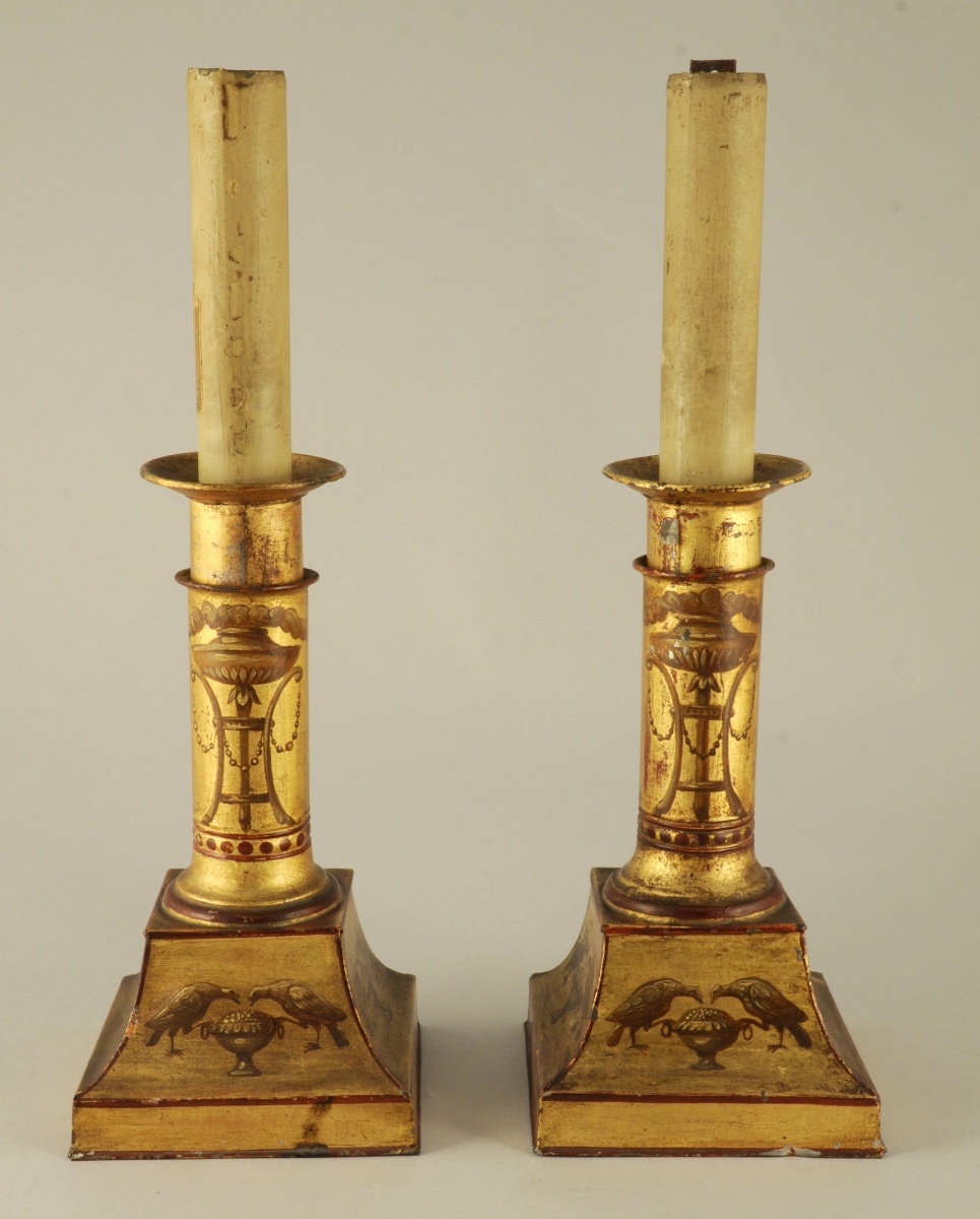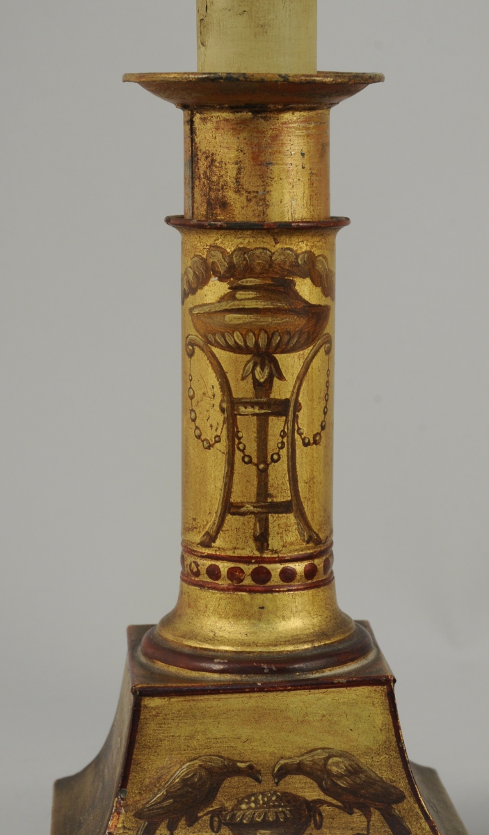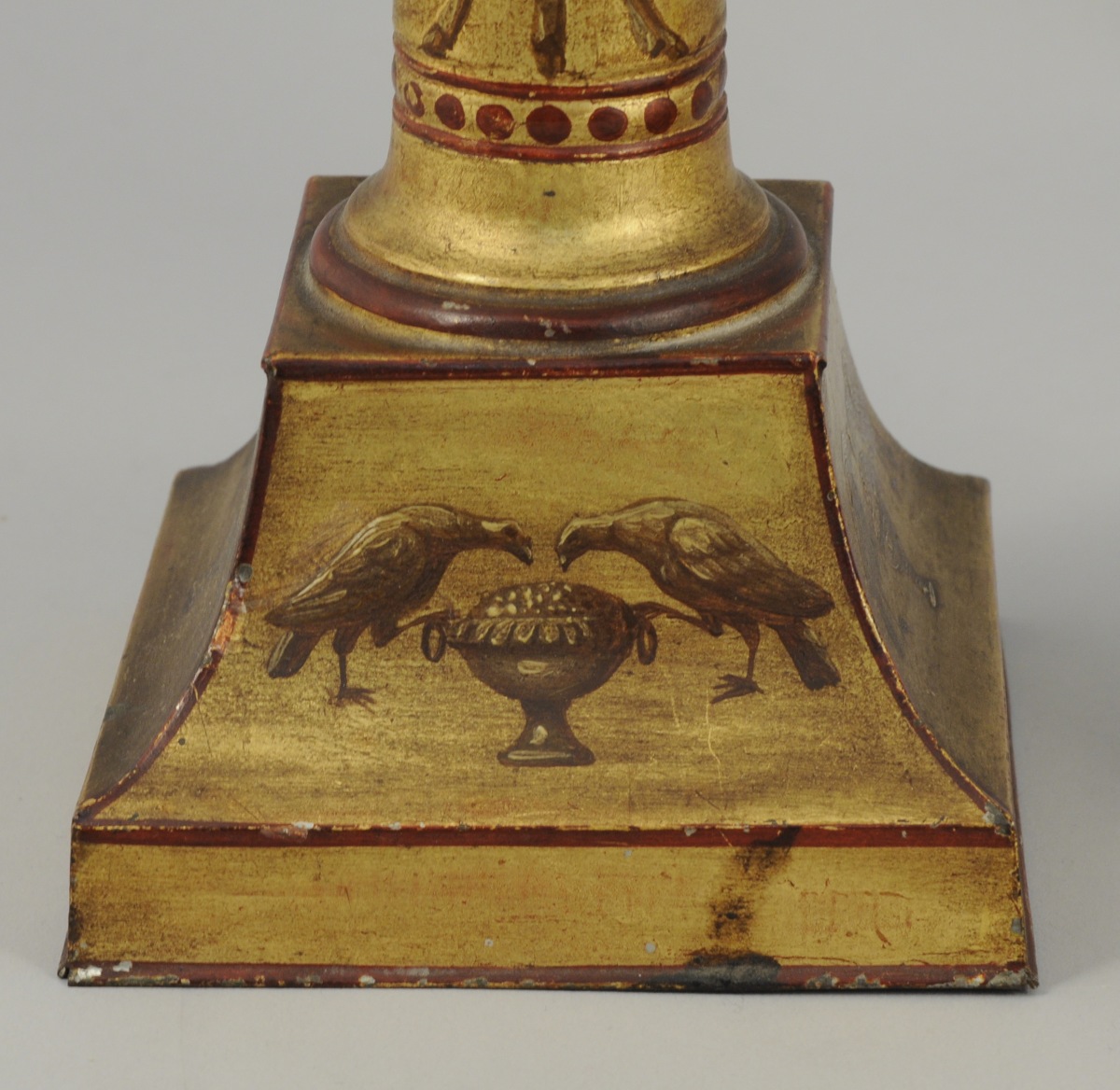 PAIRE DE LAMPES À POMPE adoptant la forme d'une colonne soclée en tôle de fer, laquée or. Sur le socle, ornementation en camaïeu brun, d'oiseaux affrontés se nourrissant dans une coupe. Athénienne fumante sur le fût. Les arêtes soulignées de filets rouges.
