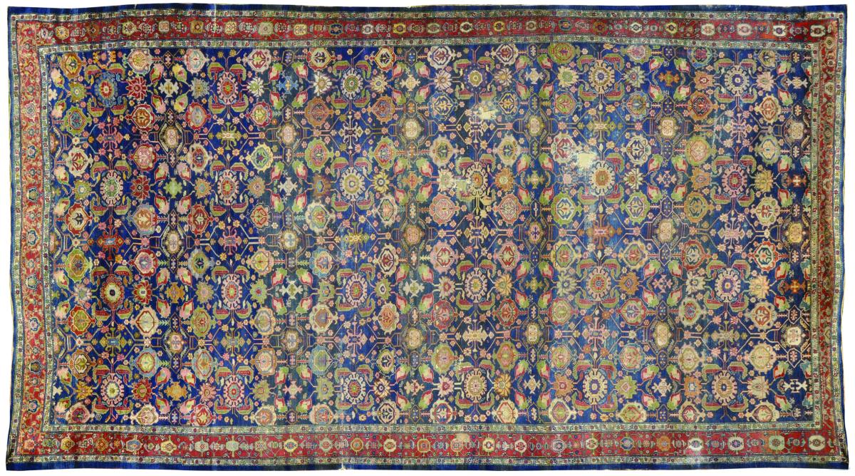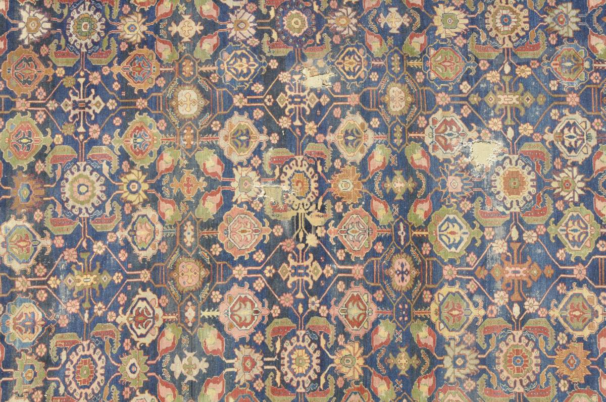 MAHAL.Grand TAPIS en laine à fond bleu orné de pattes...