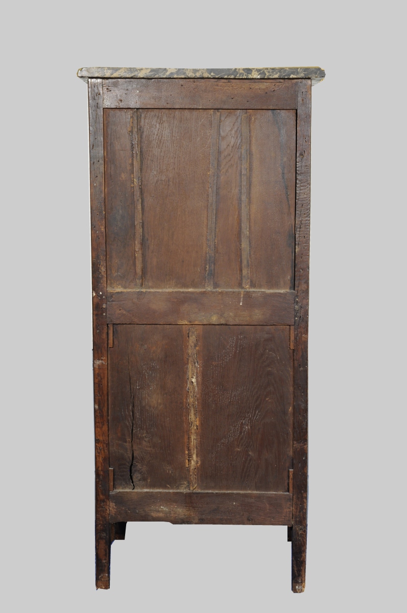 Entrées de serrures ovales en bronze doré ornées d'une guirlande de feuillages. Dessus de marbre gris.