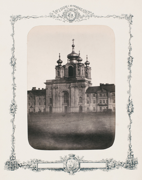 La planche présente la photographie dans un beau décor imprimé de branches et de feuilles avec dans la partie supérieure une couronne avec la mention "Widoki M. Warszawy" et dans la partie inférieure la date "1858" sous la sirène surmontée d'une couronne, emblème de la ville.