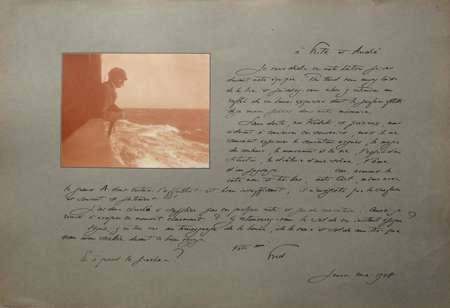 La première planche du portfolio représente Boissonnas contemplant l'Océan depuis le pont du bateau emmenant les trois compagnons vers l'Égypte, accompagné d'un texte "à Fritz et André [...] Genève mai 1908" dans lequel il leur dédie les souvenirs de ce voyage épique.