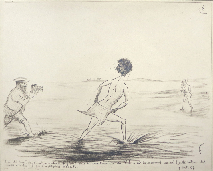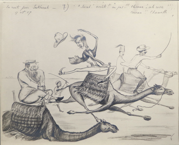 Les caricatures apportent une touche comique à l'ensemble et représentent les amis dans des situations cocasses : "Dans la baie de Bonifaccio Fritz note, Fred croque et Tap guigne", essayage de tenues et chapeaux à Alexandrie pour "affronter aussi bien les ardeurs du soleil des tropiques que le feu des regards des belles égyptiennes", Tap harcelé au bazar du Caire, Sarah la chamelle, Fritz montant péniblement son gros derrière en haut des pyramides ("Bravo mousié Baron"), les amis sur Le Nicolas II qui les emmène en Grèce, vêtus de djellabas "en quarantaine" sur l'île de Salamine, en toges sur L'Acropole...