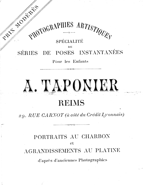 de "A.Taponier 29 rue Carnot à Reims" : 14,5 x 10,5 cm.