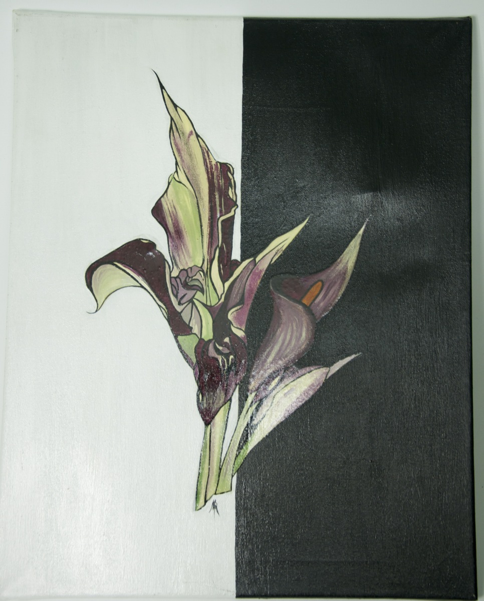 Huile sur toile, Iris et arome à l'acrylique. Fond bicolore composé d'aplats noir et blanc. Le motif floral est verni. Monogrammé en bas " MR ", contresigné et daté au dos " Marceline Robert, Février 2009 "
