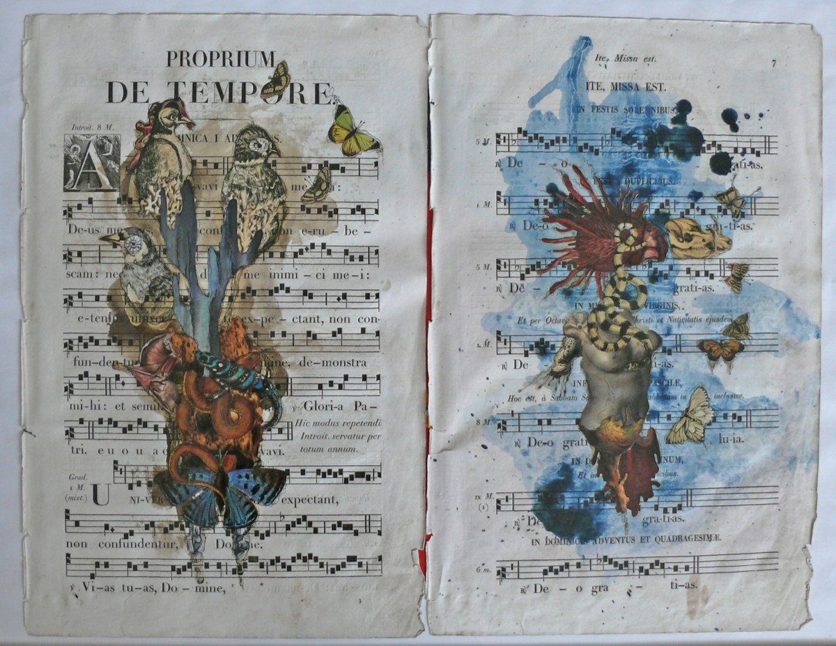 L'uvre présentée ici est la représentation de deux corps célestes sur une liturgie du 19e. La musique porte le dessin, le fait voyager, ces corps hiératiques semblent alors se positionner dans un univers mystique, ou la musique peut être soit un environnement sonore, soit émaner d'eux telle une complainte sacrée.