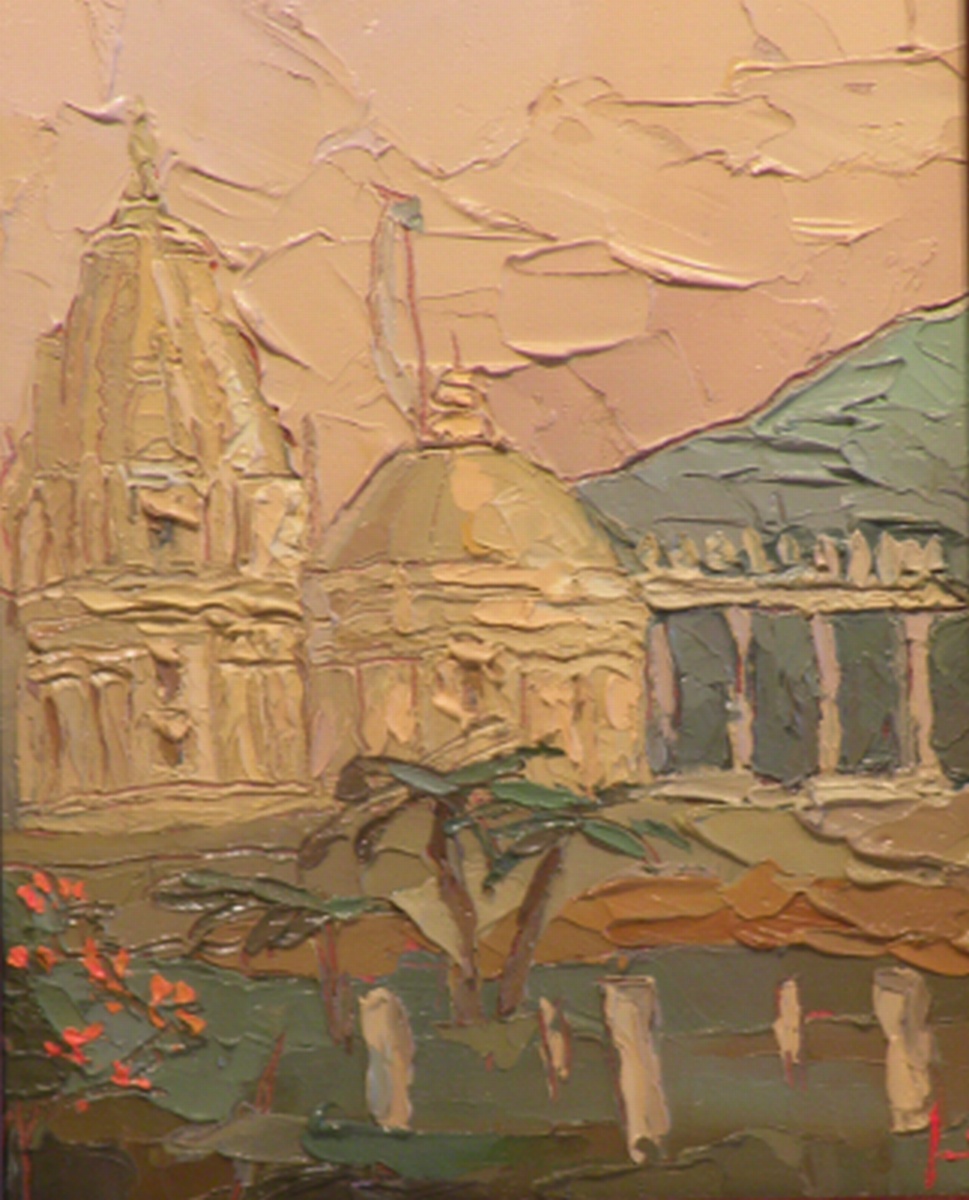 Huile sur carton entoilé représentant un des Temples de Ranakpur, petite cité du Rajasthan.