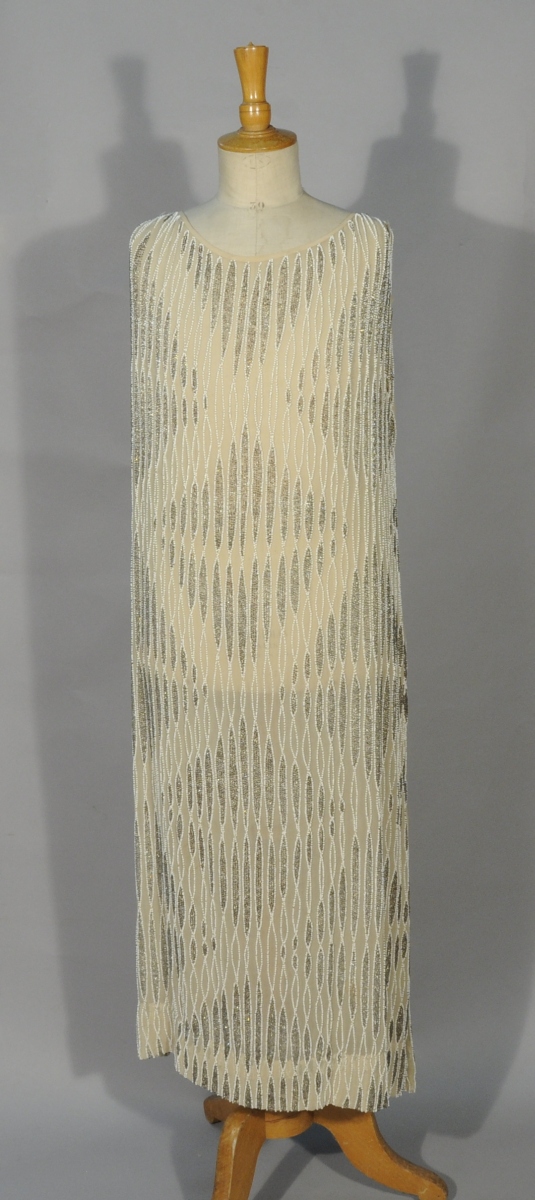 ROBE CHARLESTON 1925 en crêpe café au lait brodé de perles de verre blanches et argent.