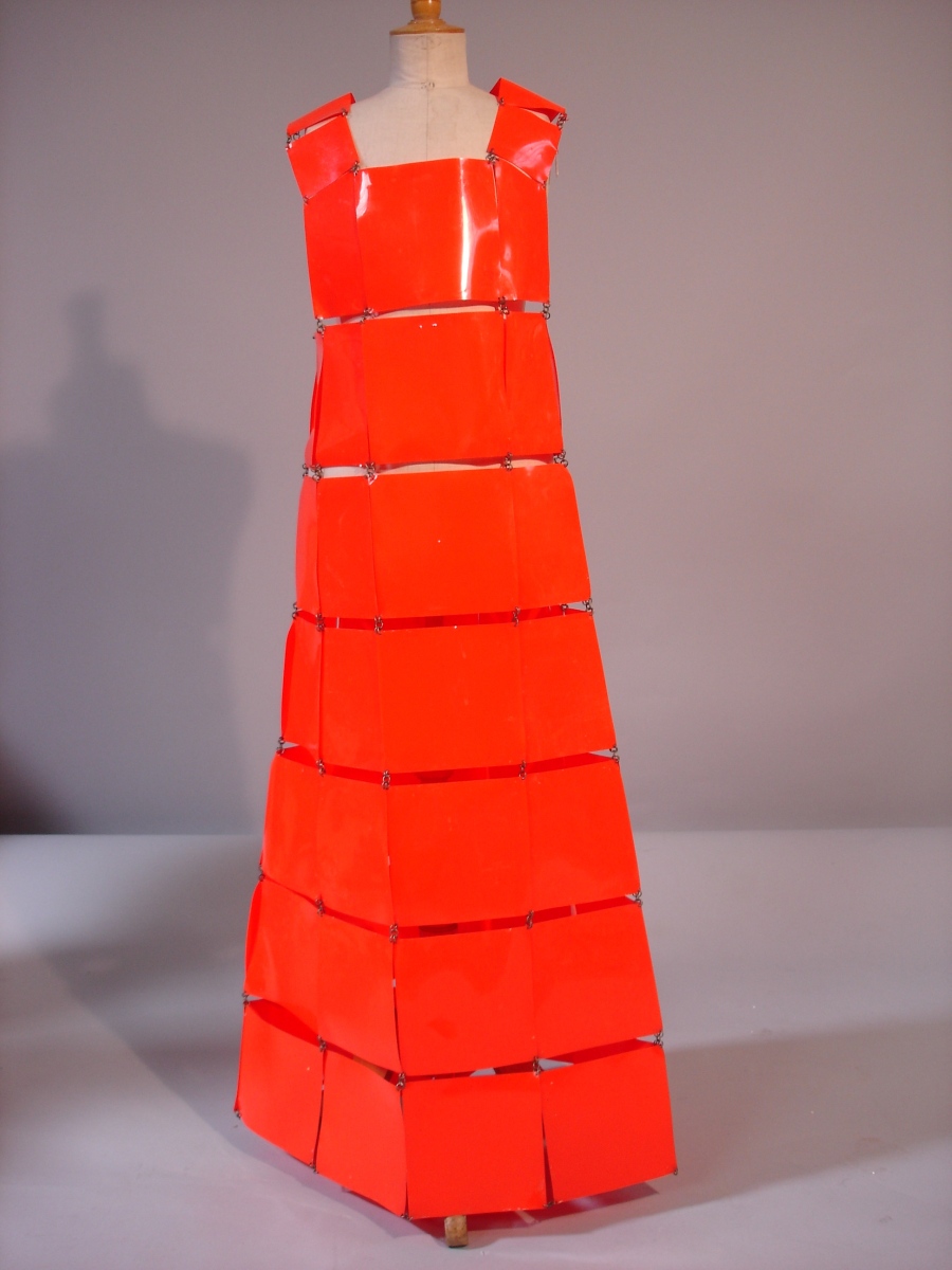 PACO RABANNE (attribué à). Robe-tunique en carreaux corail plastique.