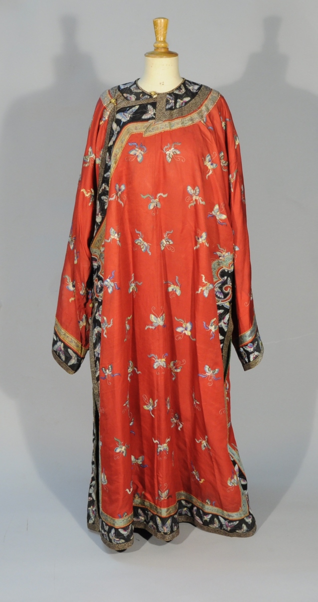 CHINE. ROBE de taffetas rouge bordé d'un galon noir brodée de papillons. Boutons grelots.