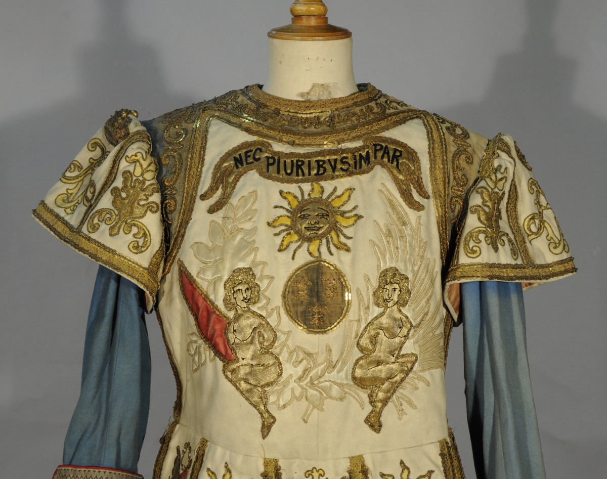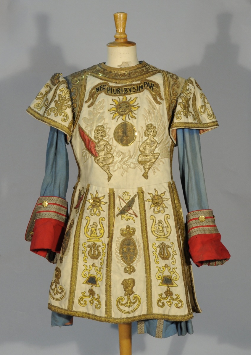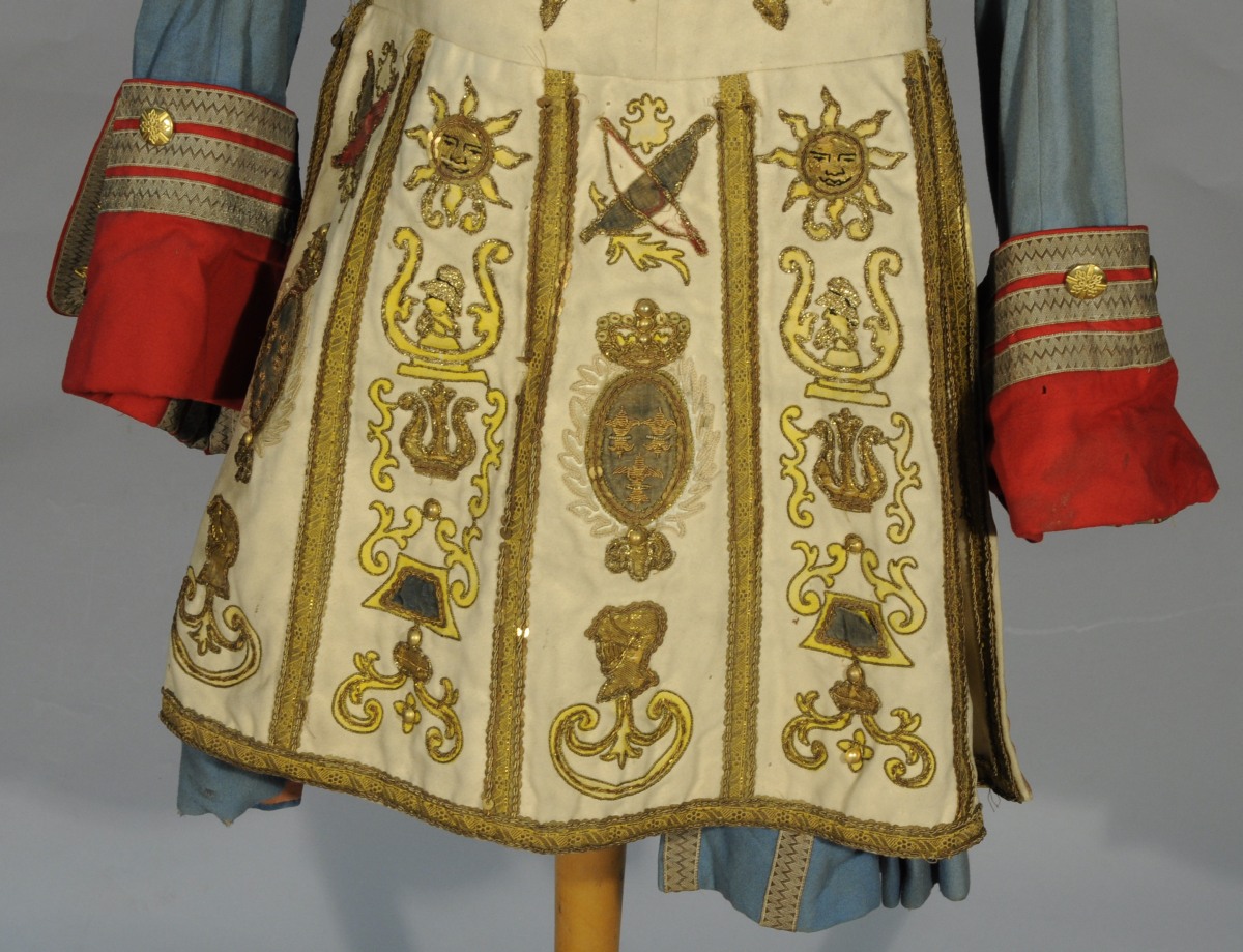 TABARD de théâtre. Feutre bleu couvert de feutre blanc brodé or. Personnages et armes de France.