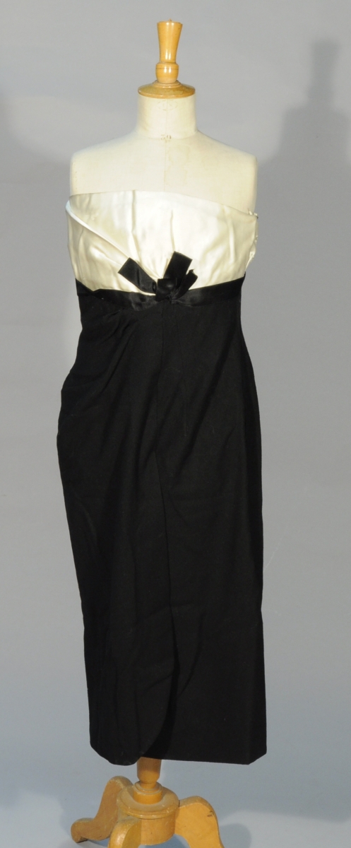 ROBE de COKTAIL griffée BALENCIAGA, années 1950. Bustier de satin blanc, jupe en laine noire dans des tissus Robert Perrier pour Madame Robert Perrier.