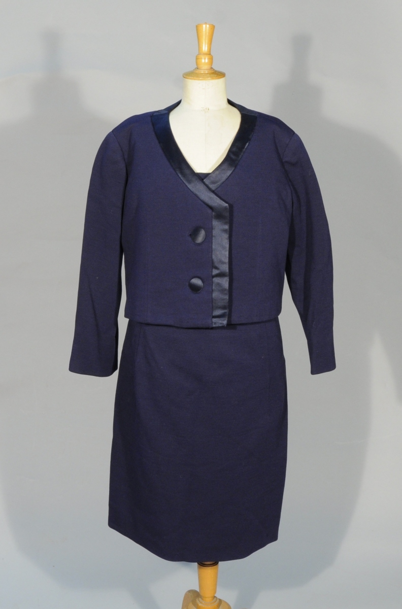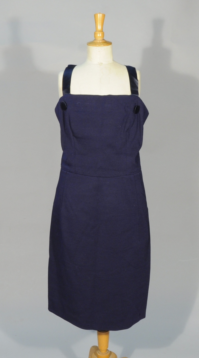ROBE FOURREAU et BOLÉRO griffés Christian DIOR, vers 1950. Jersey de laine bleu bordé d'un galon de satin bleu et boutons de satin bleu. Tissus de Robert Perrier pour Madame Robert Perrier.