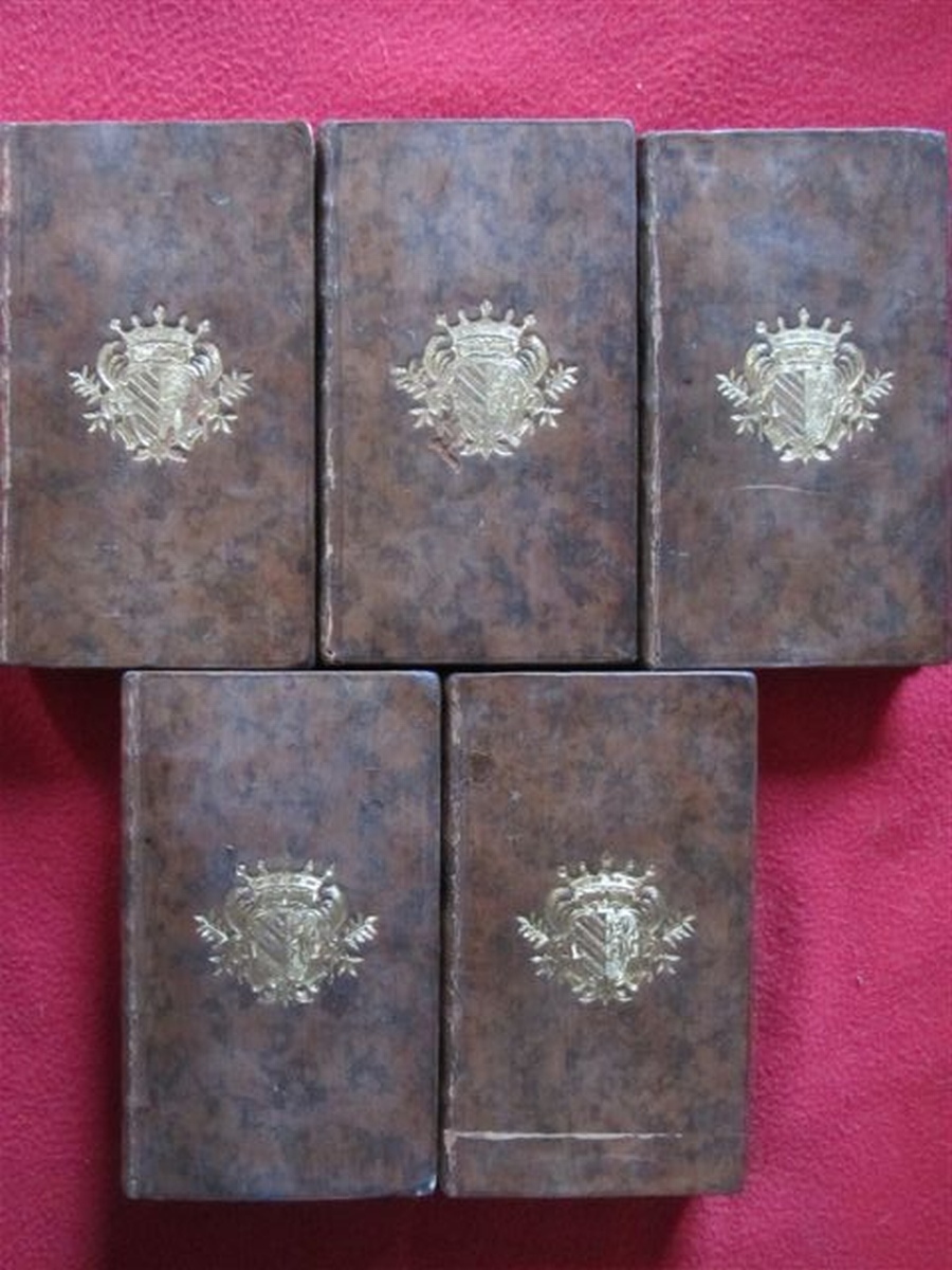 5 vol. in-12, v. ép. dos lisses ornés, plats aux armes dorées du Vicomte Edmond Montaigne de Poncins. (ex-libris du même). Pièces de tomaison un peu craquelées sinon bons ex.