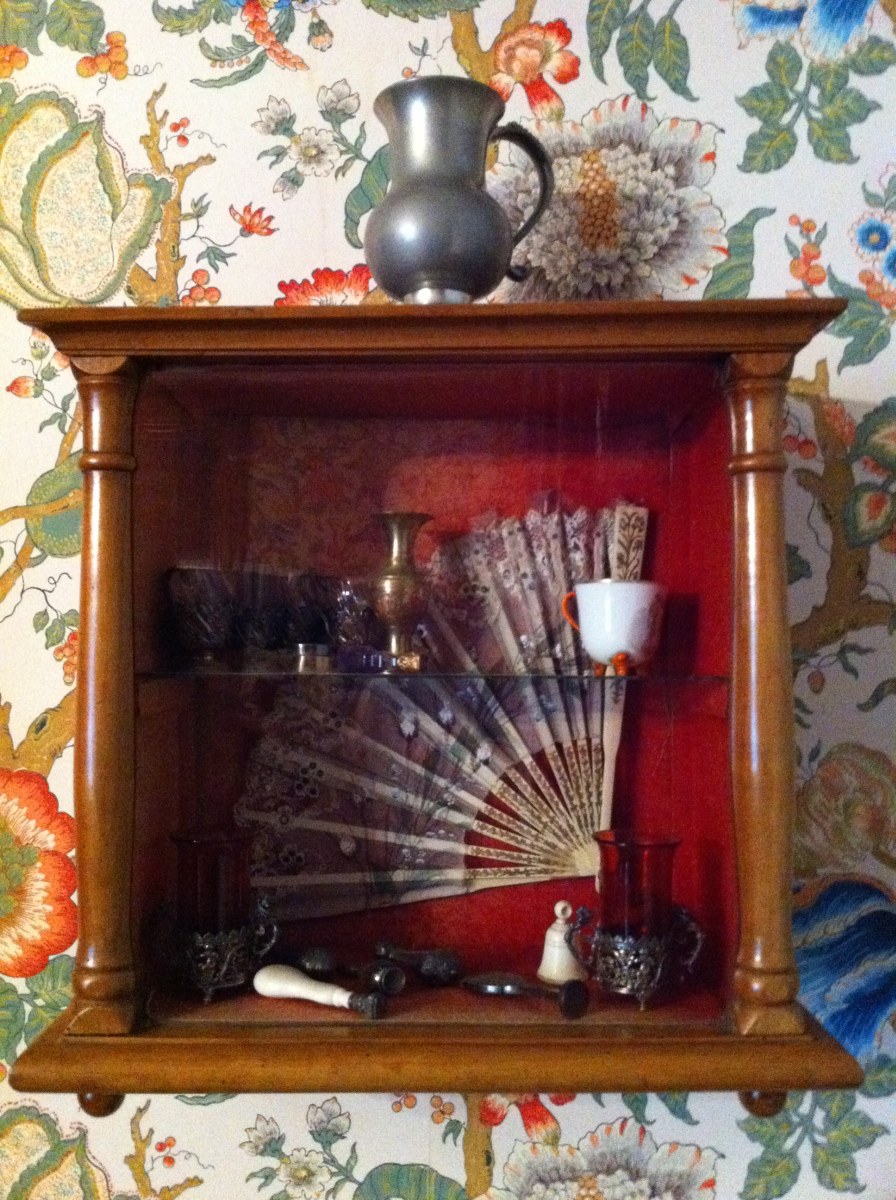 VITRINE MURALE et son contenu dont tasses en cristal sur monture en argent, cachets de cire, éventail et petits vases sur monture en argent.
