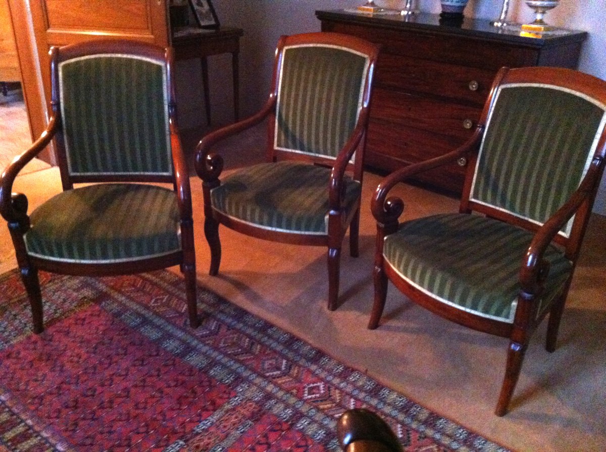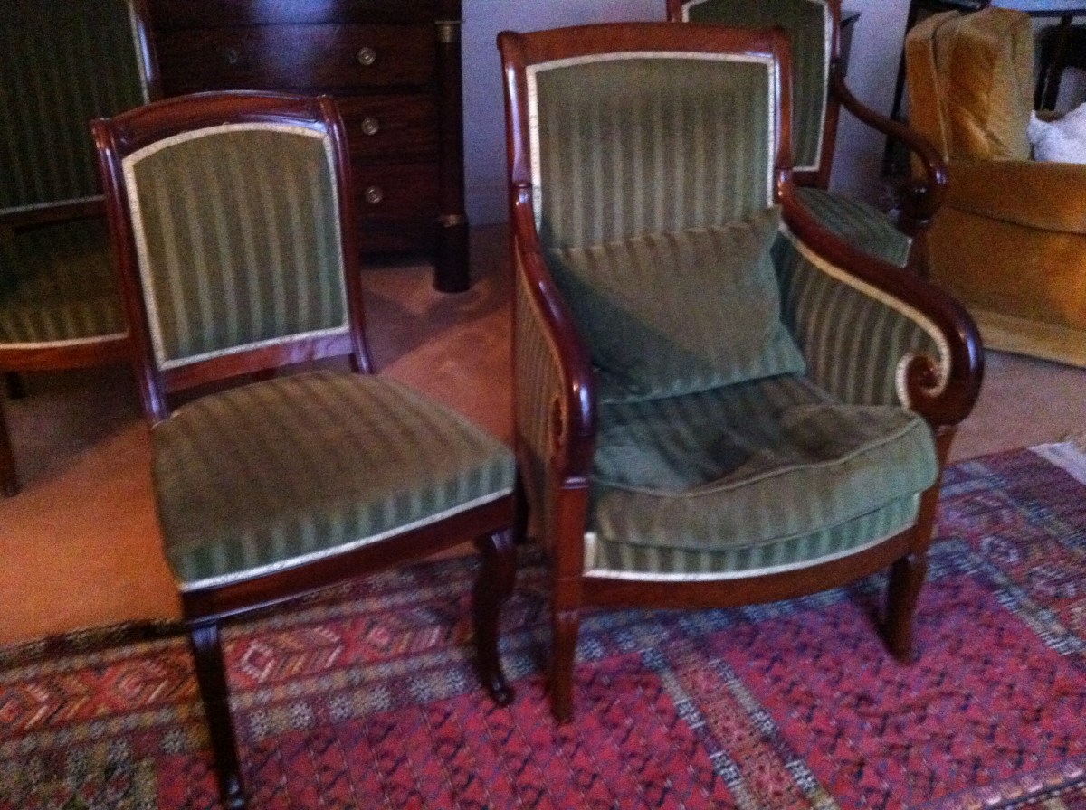 Ensemble de SIÈGES en acajou ou placage d'acajou comprenant : une paire de fauteuils, un fauteuil, une bergère et une chaise. Garniture de velours rayé. Début XIXème.