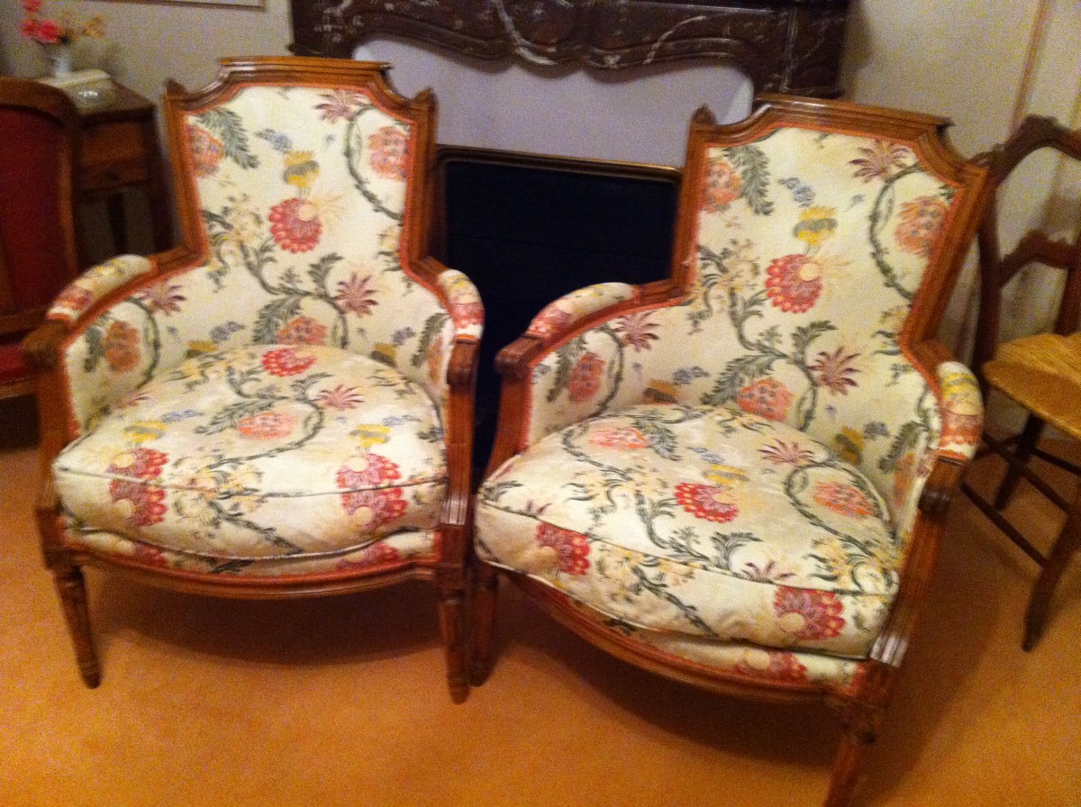 Paire de BERGÈRES en hêtre avec garniture en tissu rose. Louis XVI ancien.