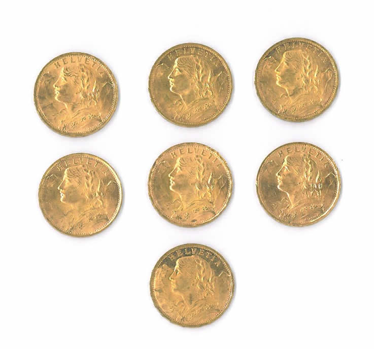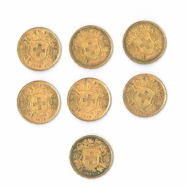 SUISSE. 7 pièces 20 francs or (1935 x 4, 1937 x 3).