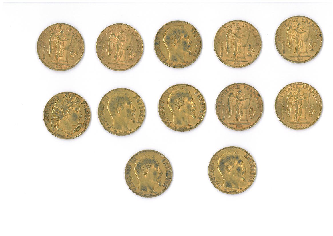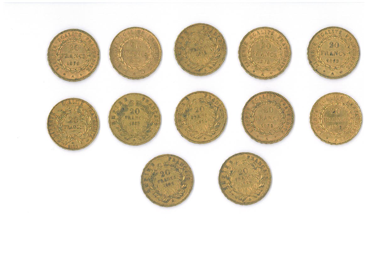 FRANCE. 12 pièces 20 francs or (1851, 1855, 1856, 1857, 1858, 1859,1875, 1876 x 2, 1878, 1879, 1898).