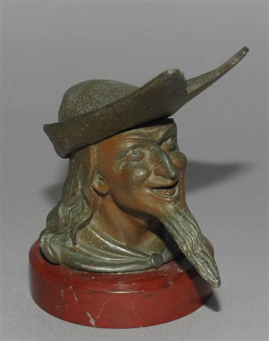 Encrier tête de ménestrel barbu et chapeauté patinée vert bronze pour un godet encrier sous couvercle charnière (le chapeau). Sur petite base circulaire en marbre griotte campan rouge. Circa fin 19ème. Diam. 8, haut. 13 cm.