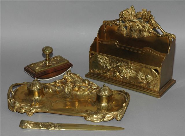 Parure de bureau en bronze doré par A. MARIONNET composée d'une grande écritoire, du classeur à courrier, du tampon buvard et du coupe papier. Le décor Art Nouveau repris sur chaque pièce représente des branchages, aiguilles et pommes de pin. L'écritoire offre deux porte- godets à couvercle charnière pour encriers en cristal, sur un grand plateau plumier à poignées en rameaux aux deux extrémités. Chaque pièce est signée A. MARIONNET, circa 1890. Long. 36, larg. 20cm.