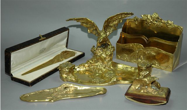 Parure de bureau complète en bronze doré par A. MARIONNET composée d'une grande écritoire, du classeur à courrier, du tampon buvard, du plumier et du coupe papier(avec son écrin). Le décor Art Nouveau repris sur chaque pièce représente un aigle aux ailes déployées sur des branchages de chêne, feuilles et glands. L'écritoire offre deux porte- godets à couvercle charnière, sur un grand plateau plumier. Pièces signées A. MARIONNET sur le plateau, circa 1890. Long. 37, larg. 25, haut. 23 cm.