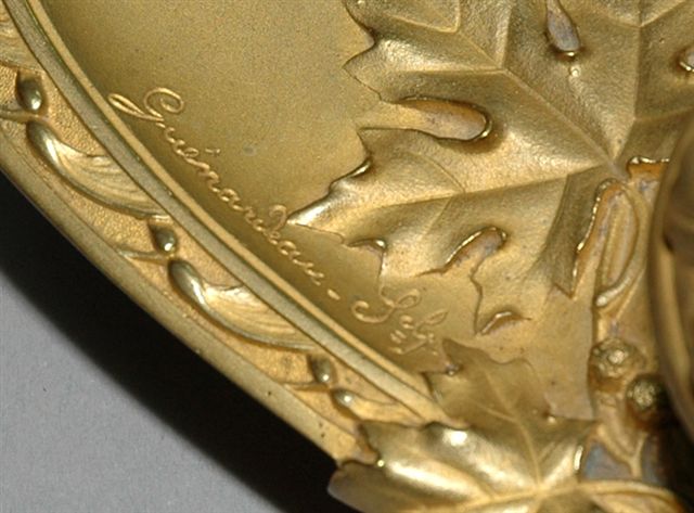 Écritoire en bronze doré par Guénardeau, décor Art Nouveau sur le thème de l'érable par les motifs de feuilles et de foènes sur le fond du plateau plumier, les porte godets encriers et leurs couvercles charnière ainsi que le dosseret. Pièce signée Guénardeau sclptr et SUSSE Fres Edt. circa fin 19ème. Long. 35, larg. 20, haut. 7 cm.