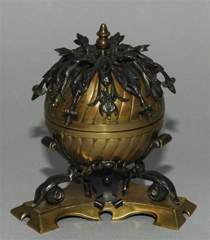 Encrier époque N III en bronze doré et patiné d'un globe à décor godron reposant sur un pied tripode posé sur une base triangulaire ainsi qu'une mappemonde. La demi sphère supérieure est couverte de ramures en bronze à patine sombre et la demi sphère inférieure révèle le godet encrier en porcelaine blanche. circa fin 19ème.