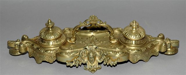 Écritoire double de centre de bureau en bronze doré forme de plateau terrasse ovoïde reposant sur quatre pieds. Les deux faces sont identiques avec en leur centre un médaillon tête de femme encadré de guirlandes végétales à usage de pieds centraux. Aux extrémités les deux autres pieds sont à viroles réglables. De chaque côté d'une poignée centrale les deux portes godets sont à couvercles charnières, circa fin 19ème.